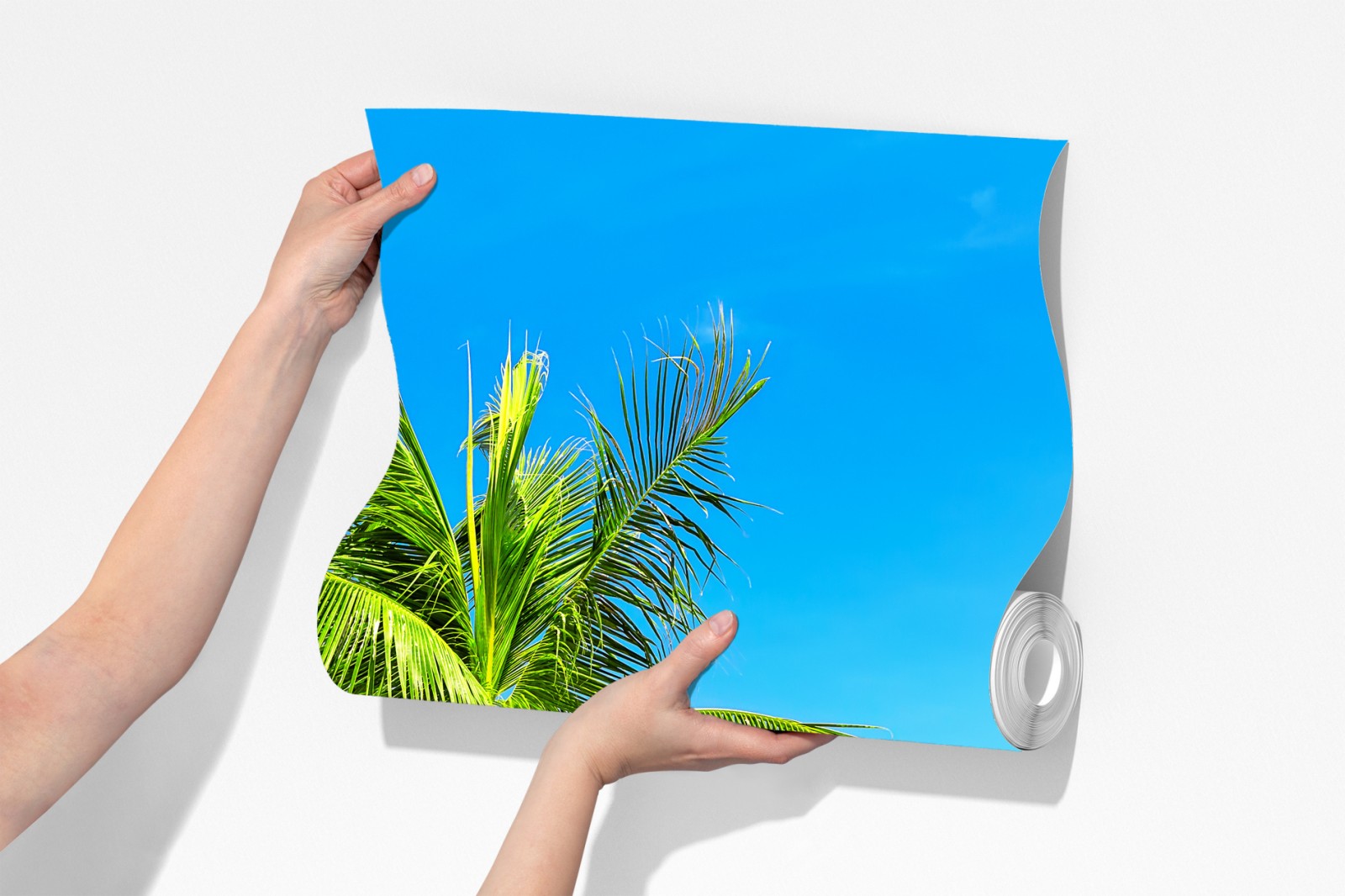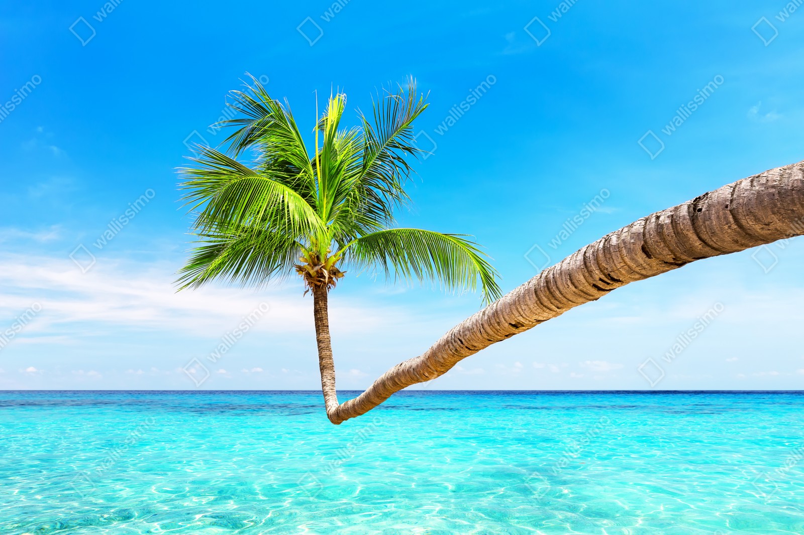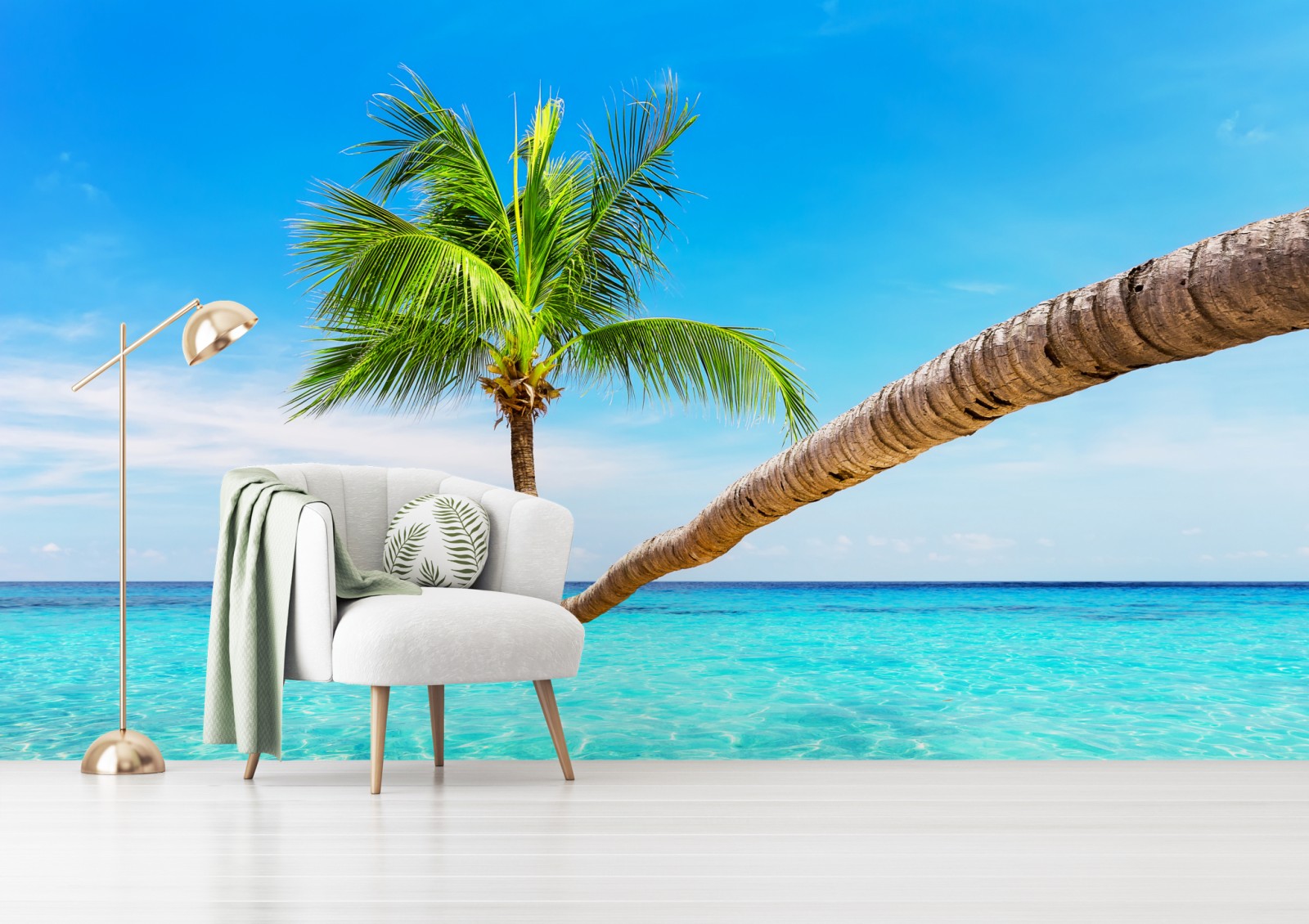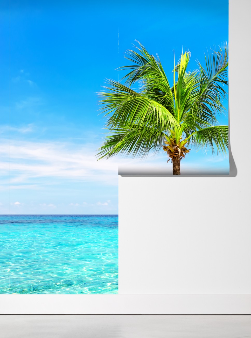 Bringen Sie tropische Ruhe in Ihr Zuhause mit einer lebendigen Palme und kristallklarem türkisfarbenem Wasser unter strahlend blauem Himmel.