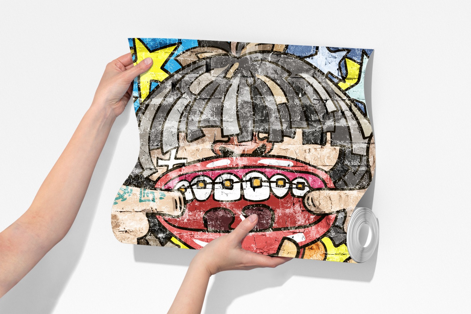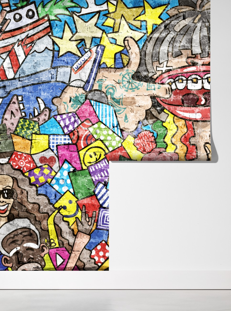 Lebendiges street-art-mural mit einer verspielten Figur, kräftigen Farben und urbaner Struktur, das jeden Raum belebt.