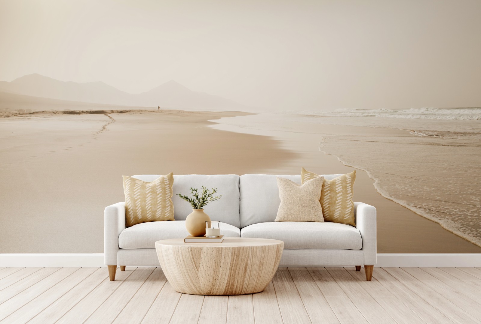 Eine minimalistische Sepiaaufnahme eines Strandes, die Wärme und Ruhe in jeden Raum bringt.MehrWeniger