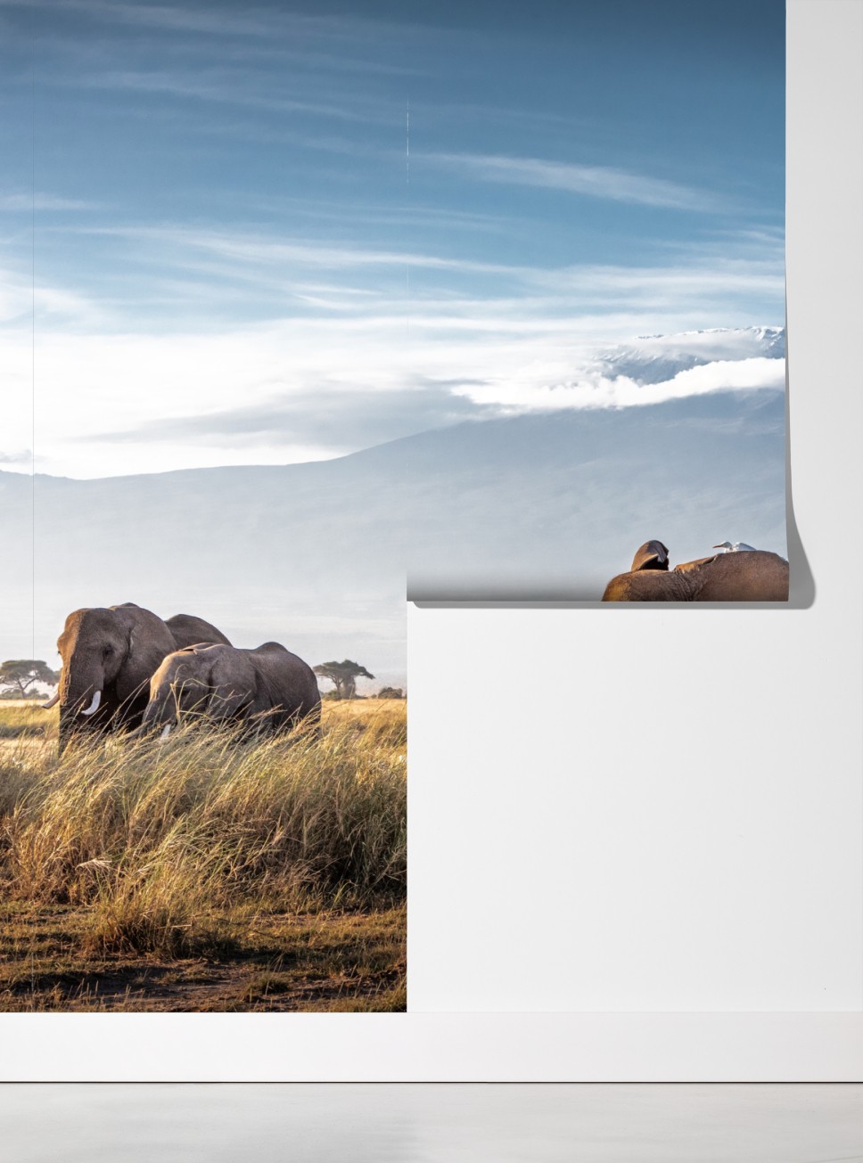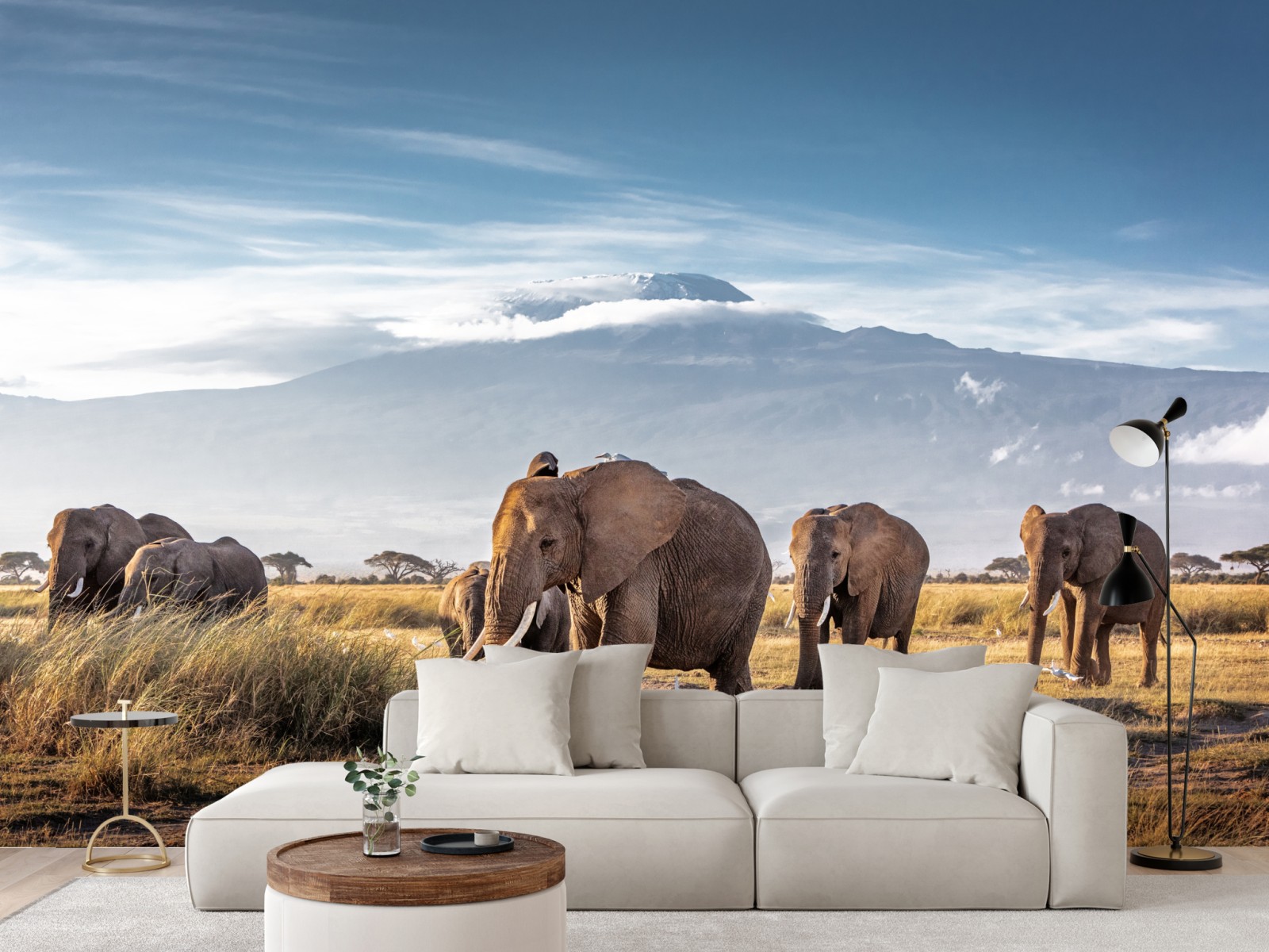 Dramatische Aufnahme einer wandernden Elefantenherde vor Kilimandscharo bringt wilde Schönheit und Ruhe an Ihre Wände.