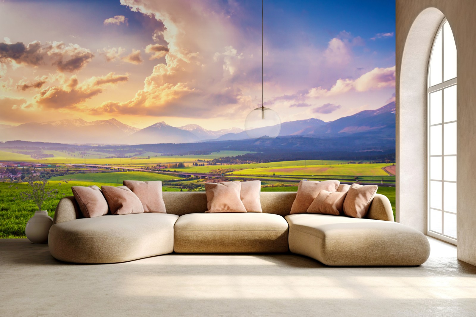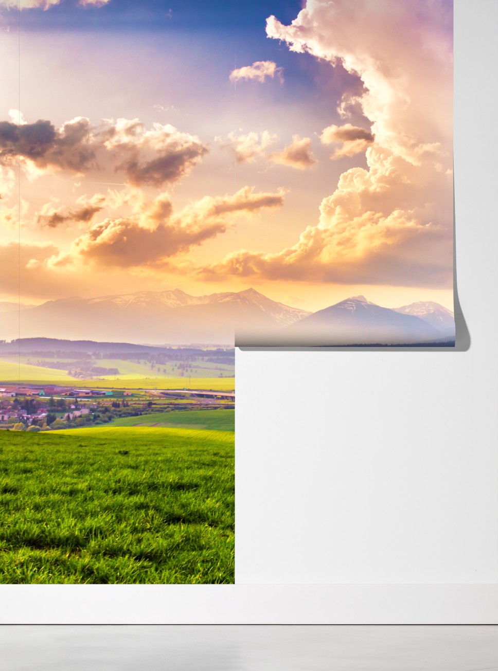 Erleben Sie die Ruhe weiter grüner Wiesen und ferner schneebedeckter Gipfel mit diesem lebendigen Panorama, das jeden Raum in eine bergige Oase verwandelt.
