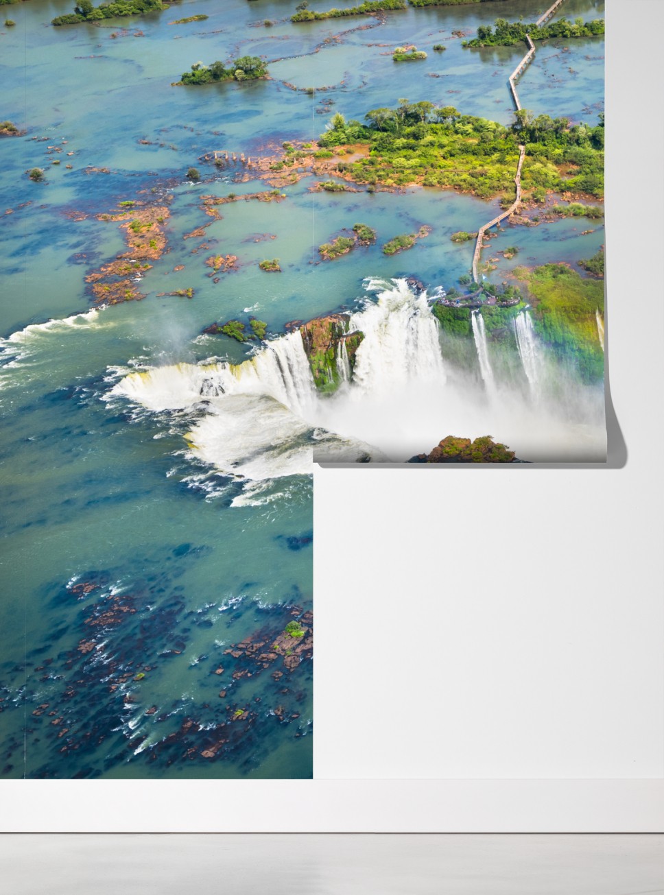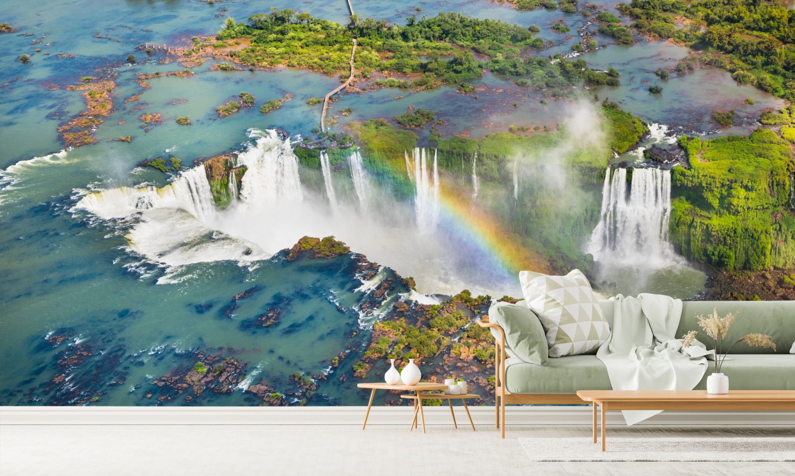 Atemberaubende Luftaufnahme eines stürzenden Wasserfalls mit einem farbintensiven Regenbogen über üppigen grünen Inseln, die natürliche Ruhe und dramatische Schönheit in jeden Raum bringt.