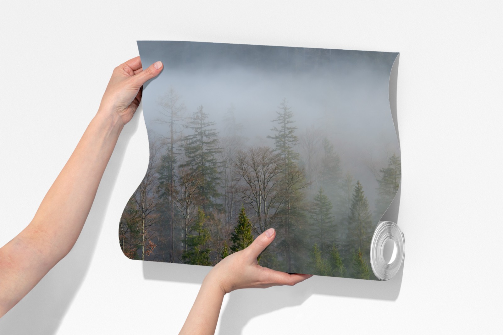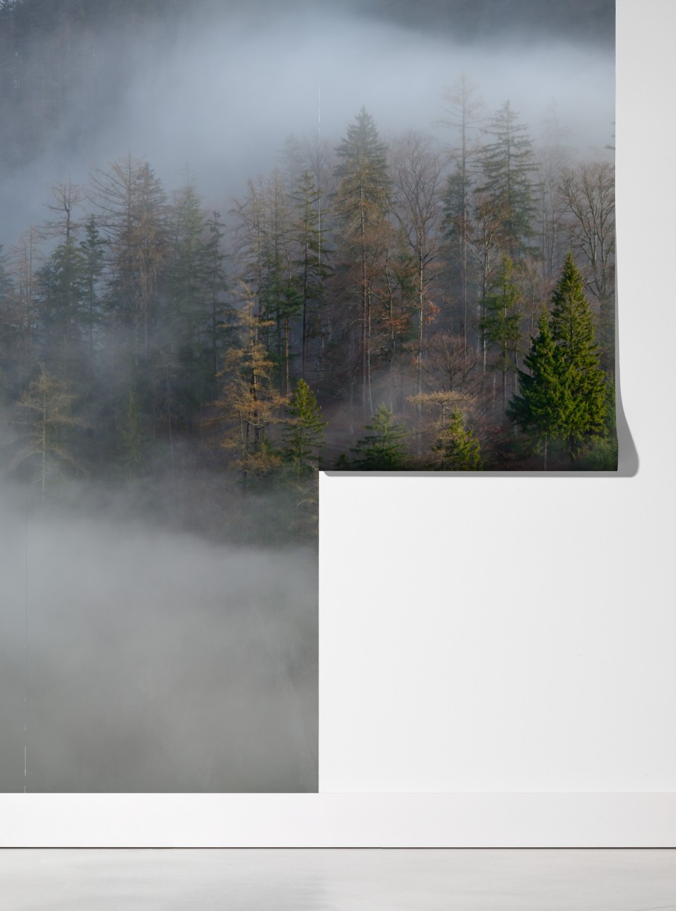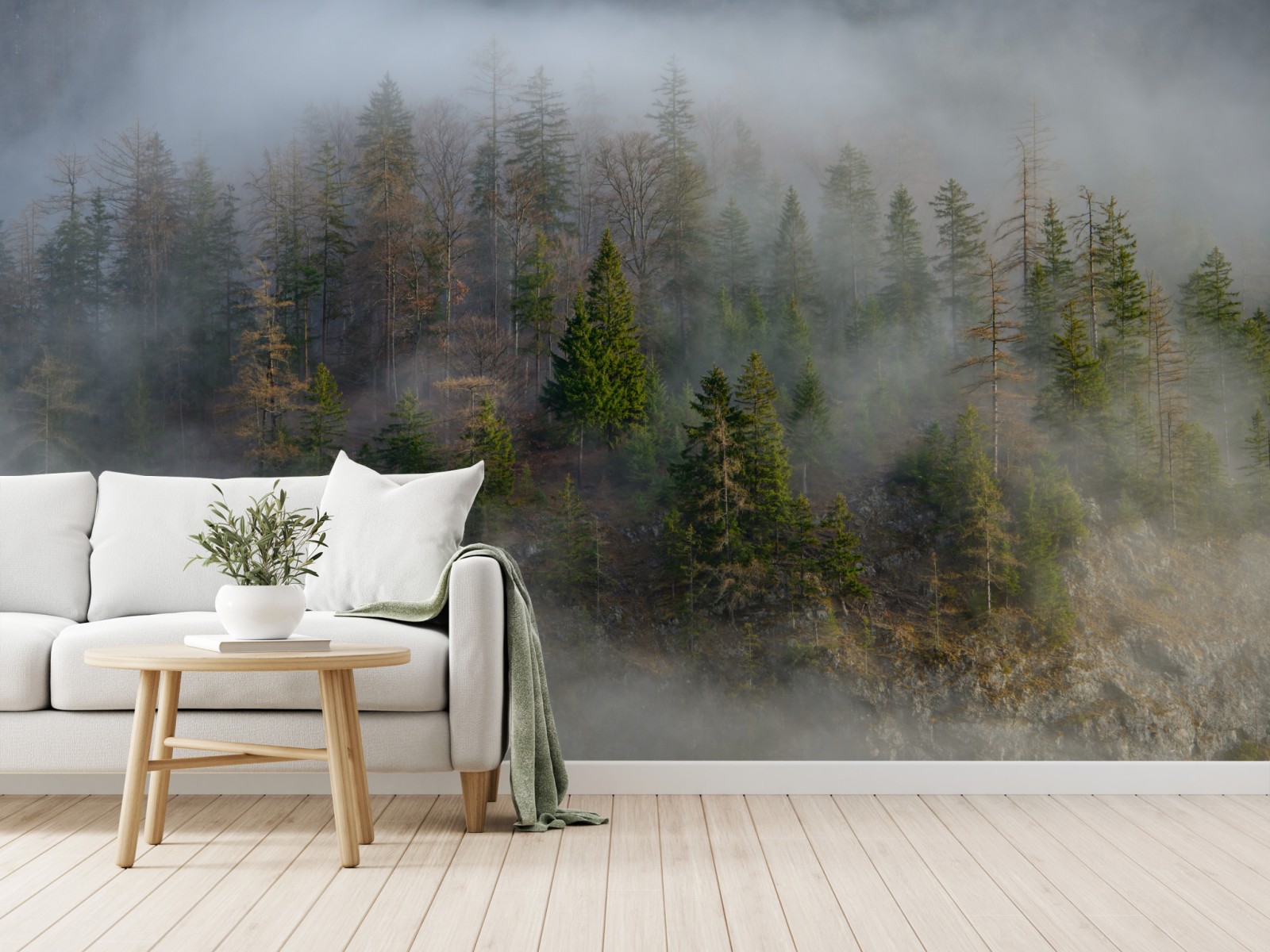 Nebliger Bergwald, der Ruhe und natürliche Atmosphäre in jeden Raum bringt.