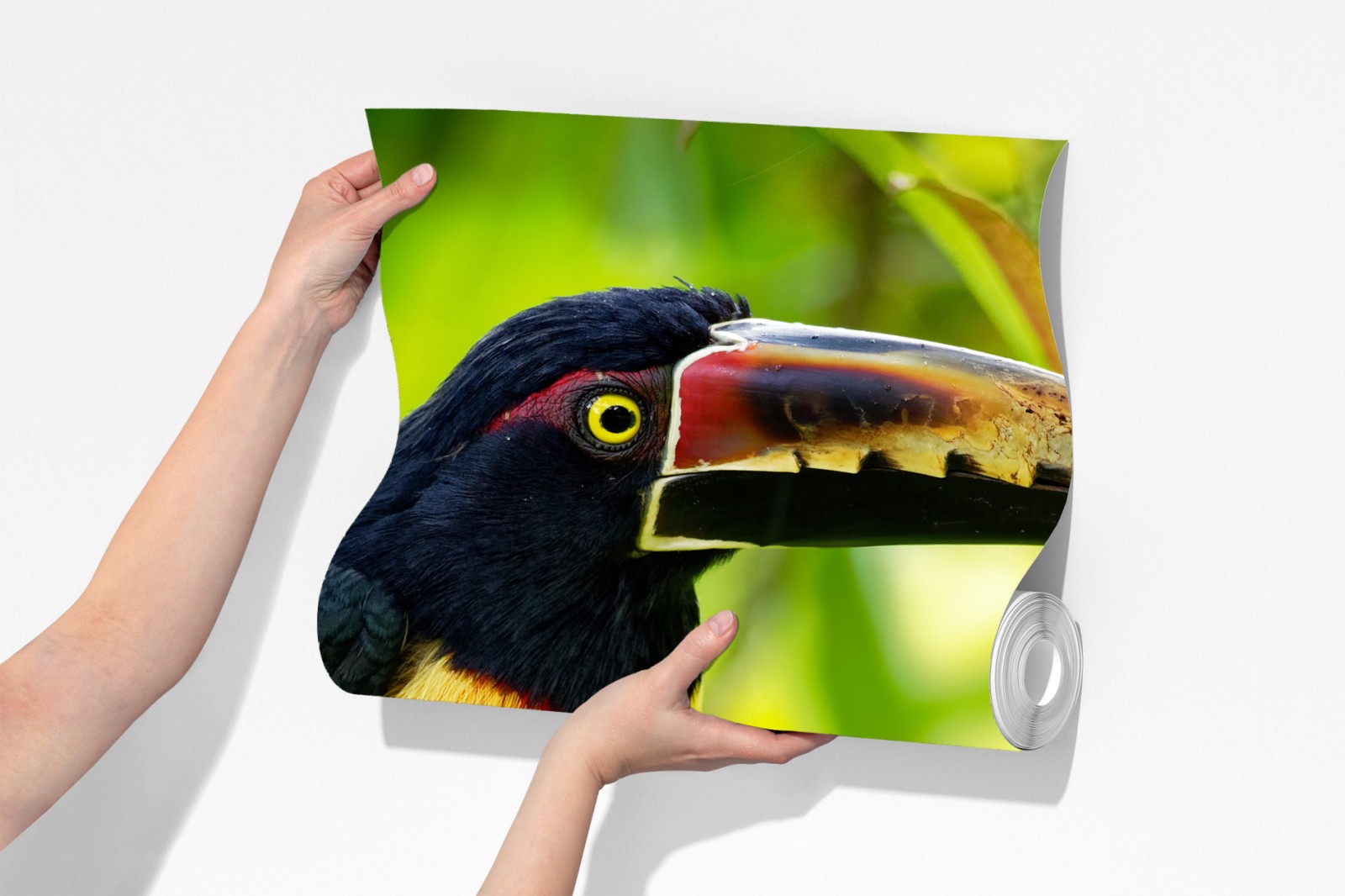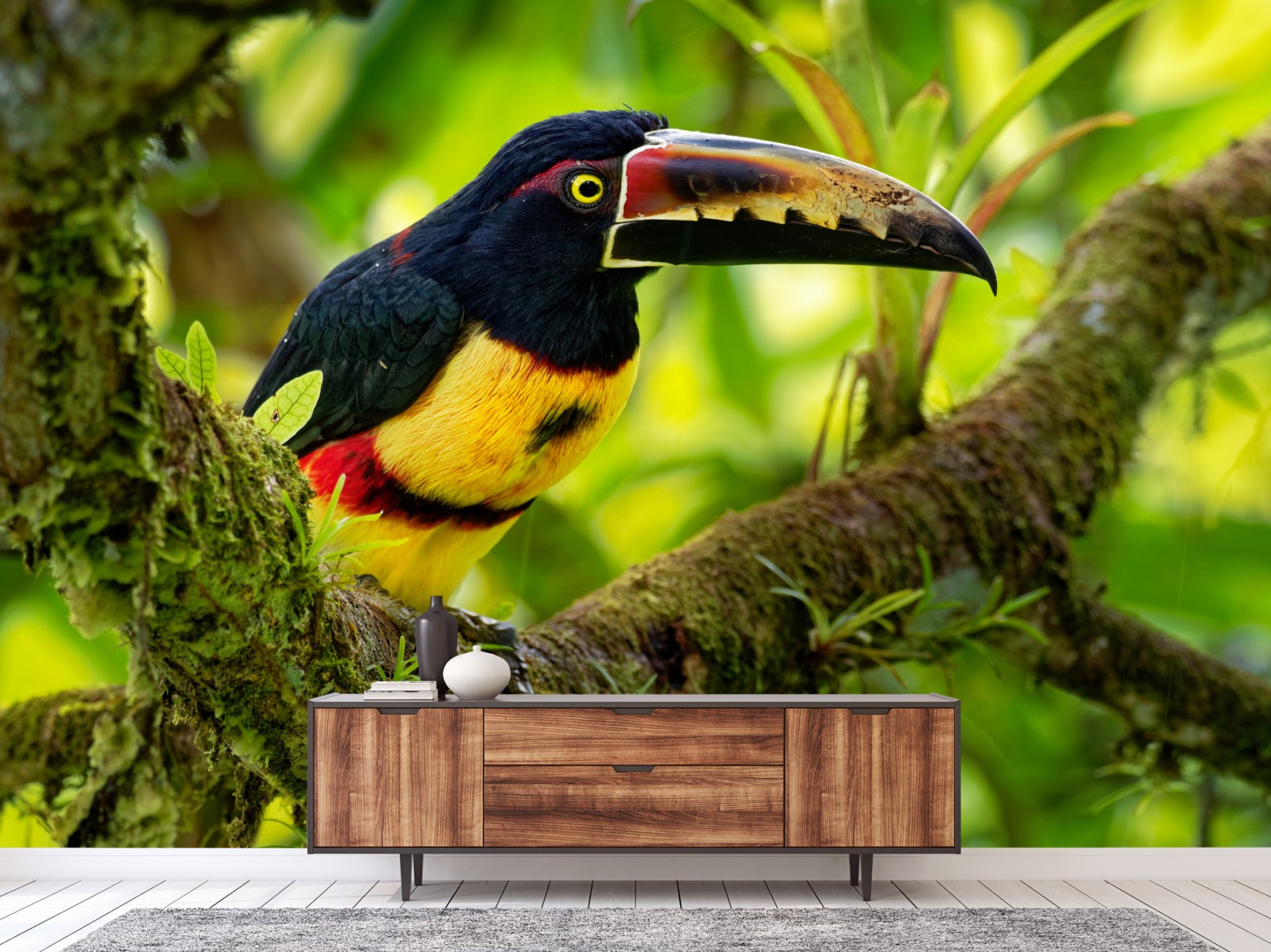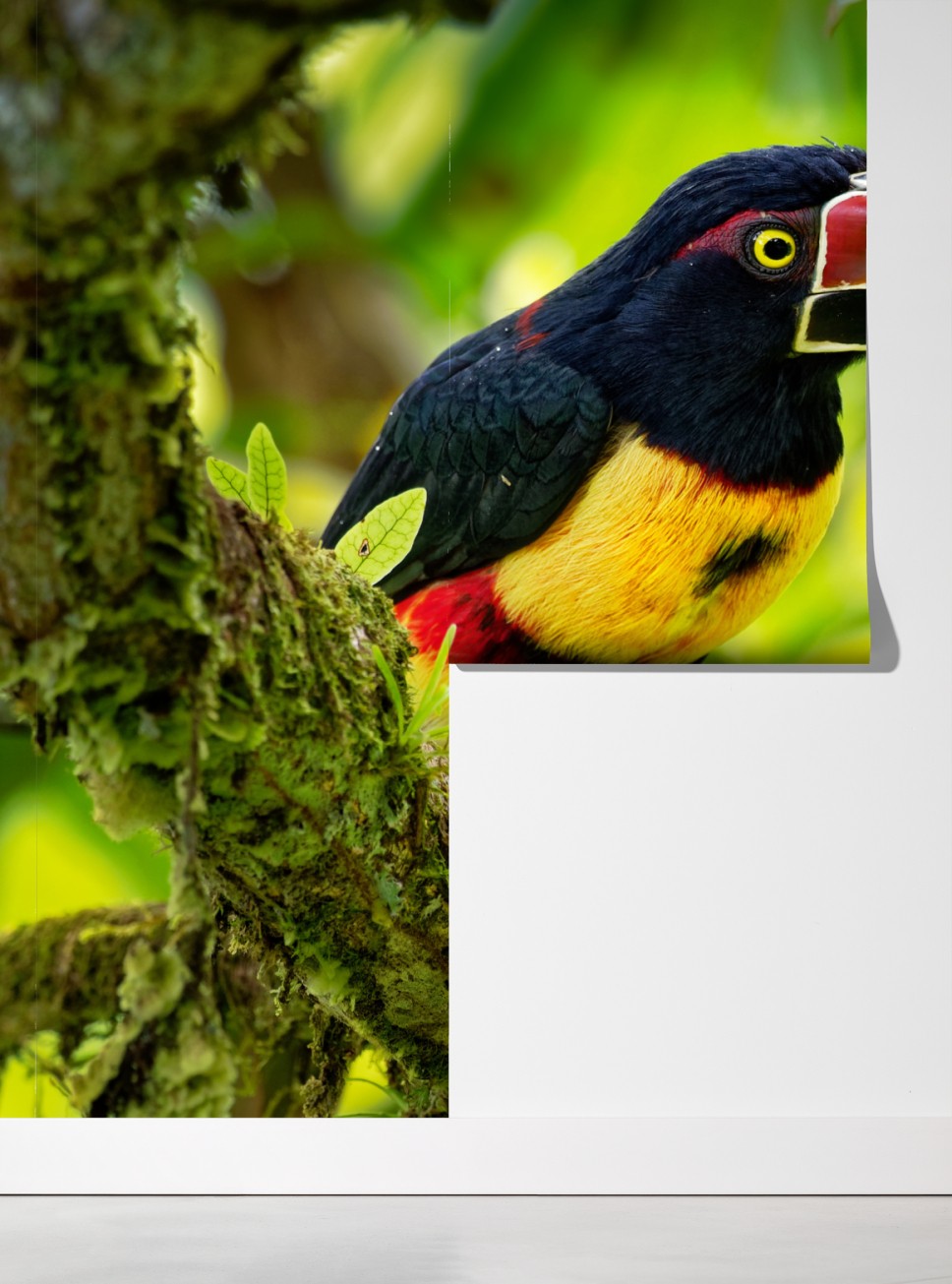 Eine eindrucksvolle Nahaufnahme eines aracari-tukans auf einem moosbewachsenen Ast bringt lebendige tropische Farben und Energie in jeden Raum.