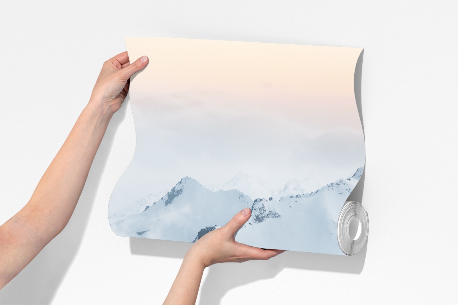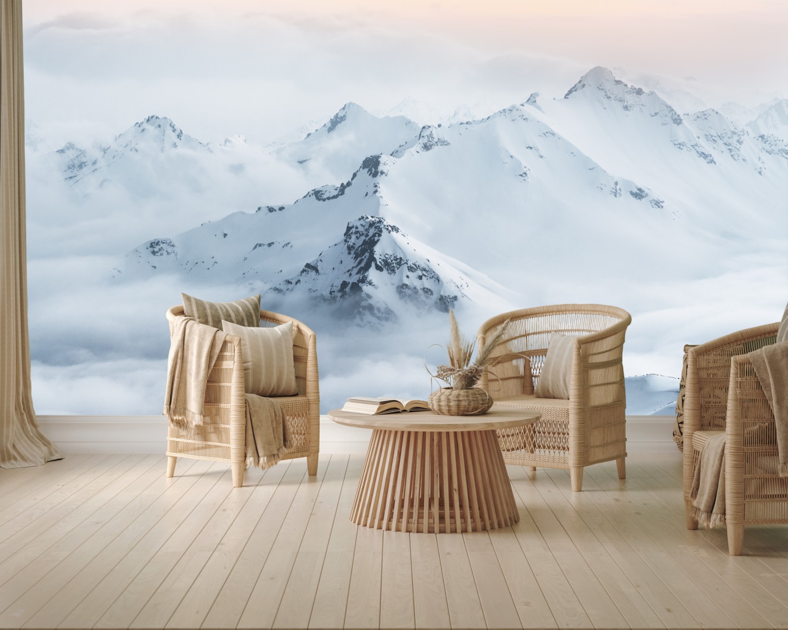Ein ruhiger Panoramablick auf die schneebedeckten Berge des Kaukasus in sanftem Pastelllicht, ideal zur Gestaltung beruhigender Wohnräume.