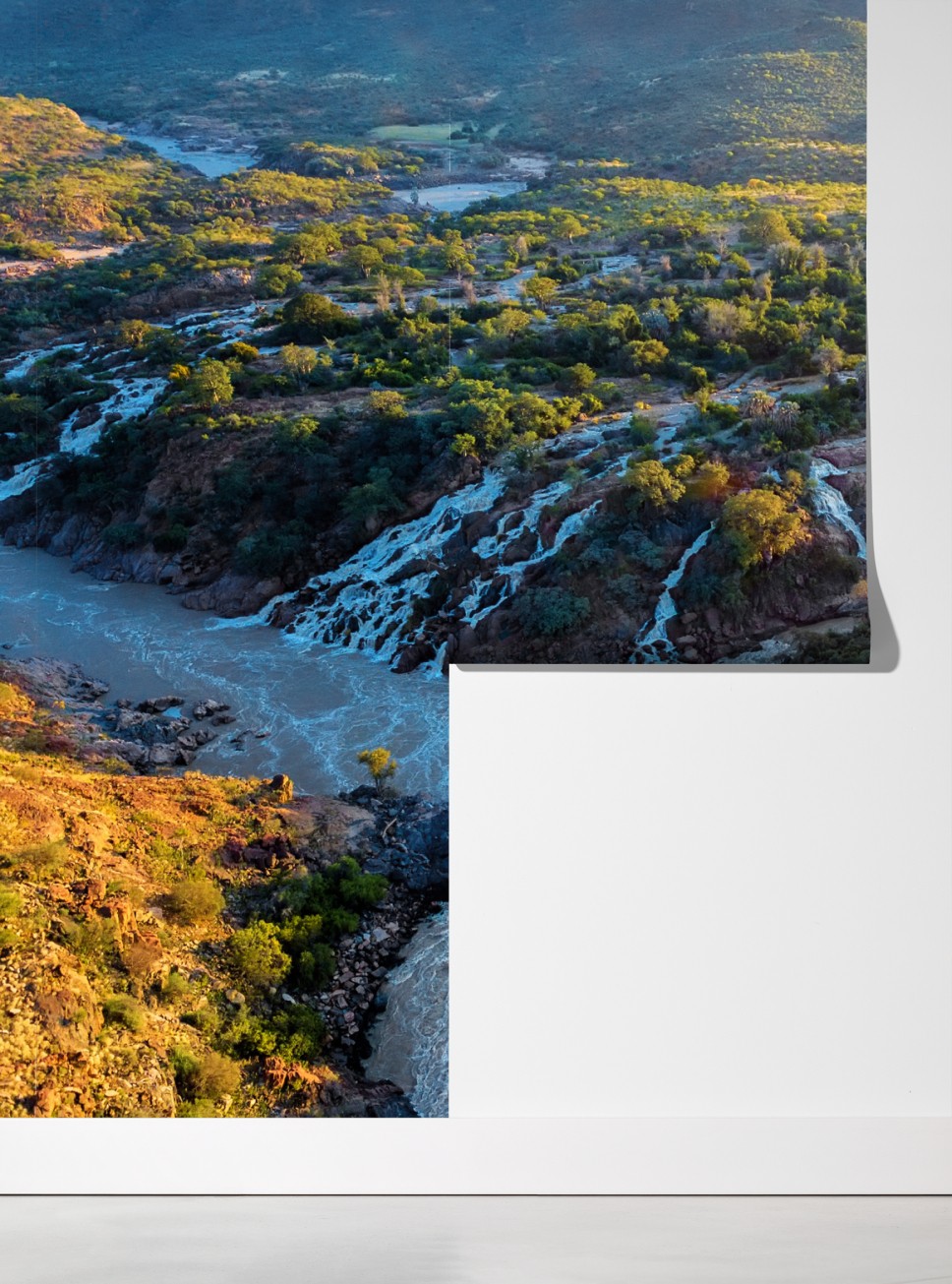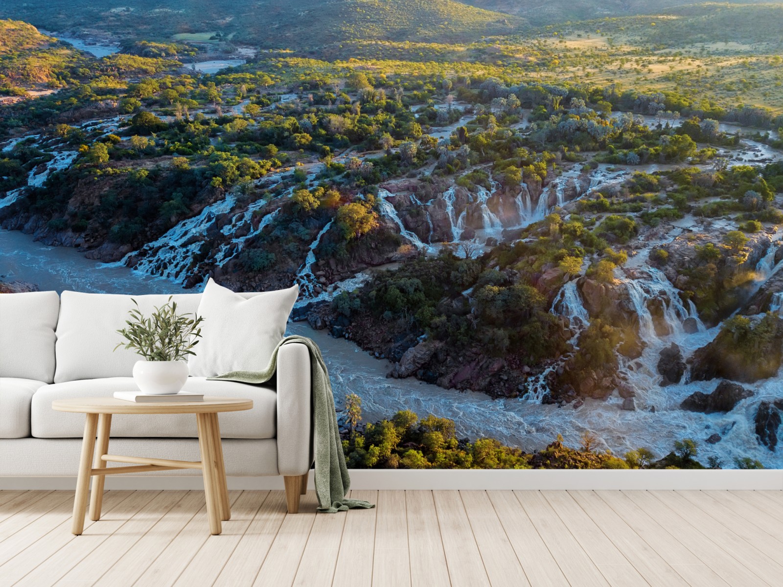 Atemberaubender Blick auf die Epupa Falls bei Sonnenaufgang mit nebligen Kaskaden und goldenem Licht, der eine ruhige, natürliche Panoramaatmosphäre schafft und jedem Raum Ruhe und Abenteuer verleiht.