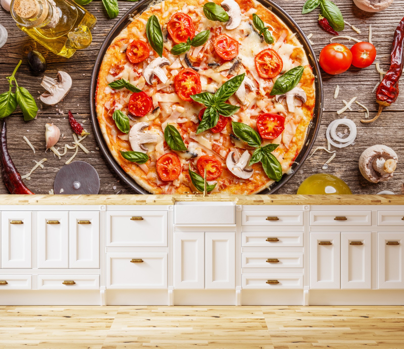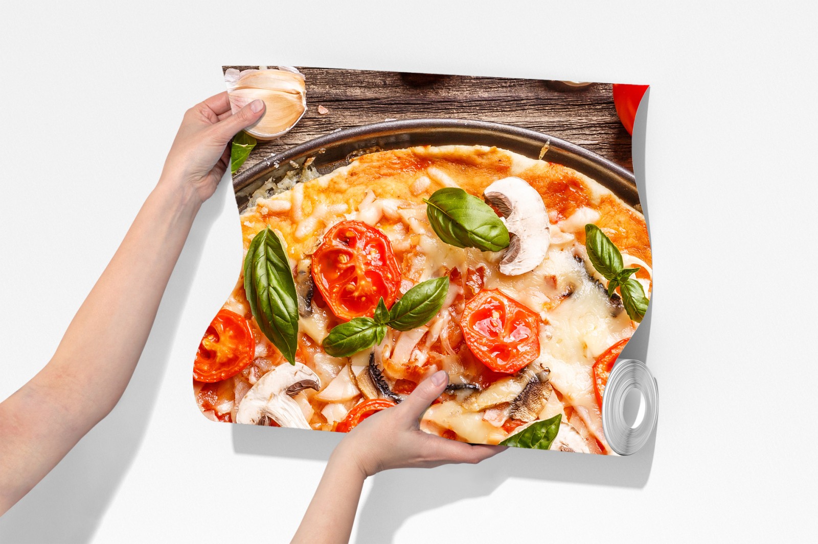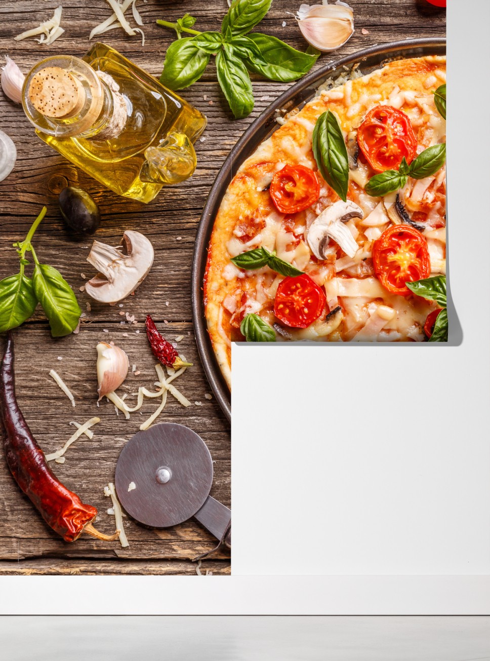 Fototapete frische pizza mit basilikum und cherrytomaten
