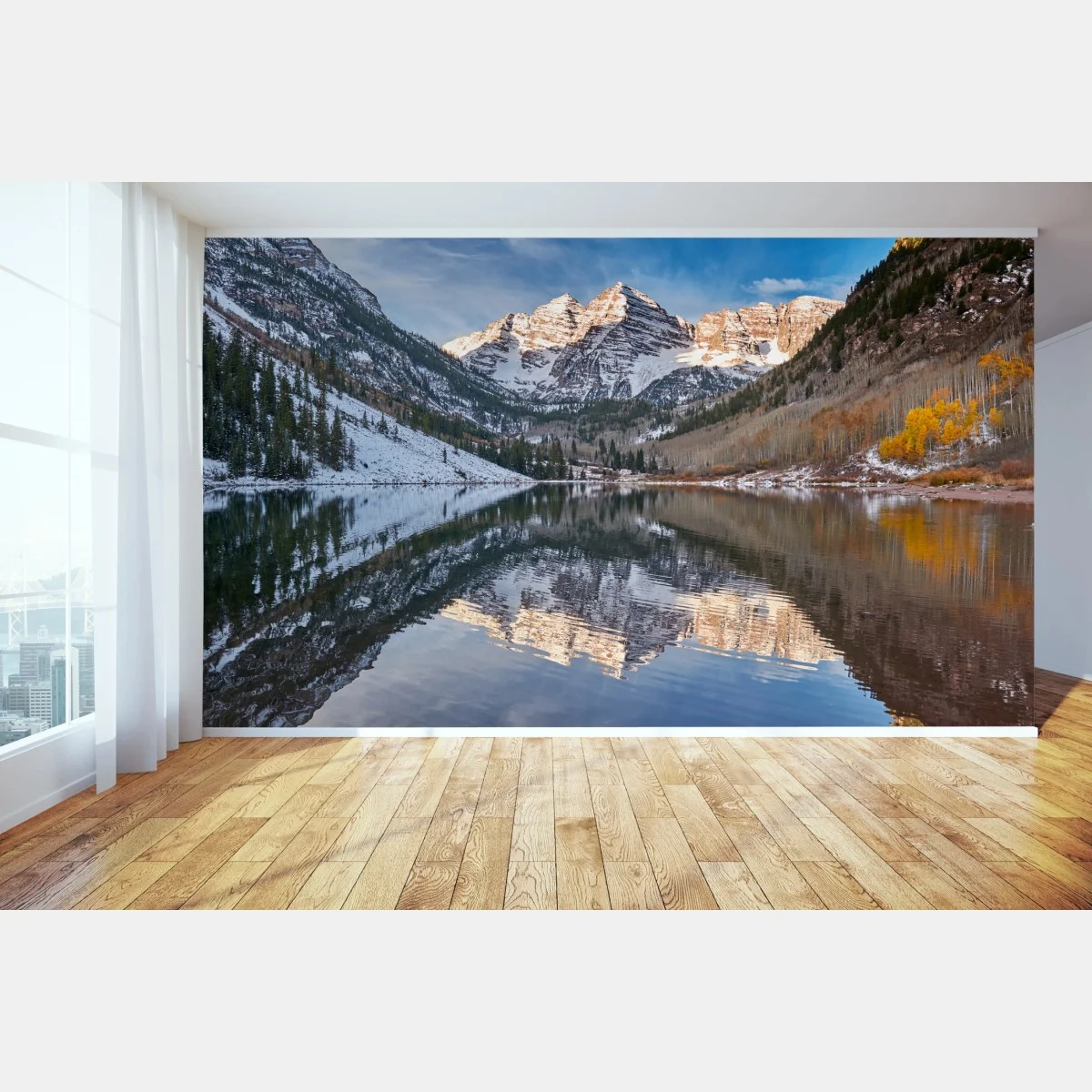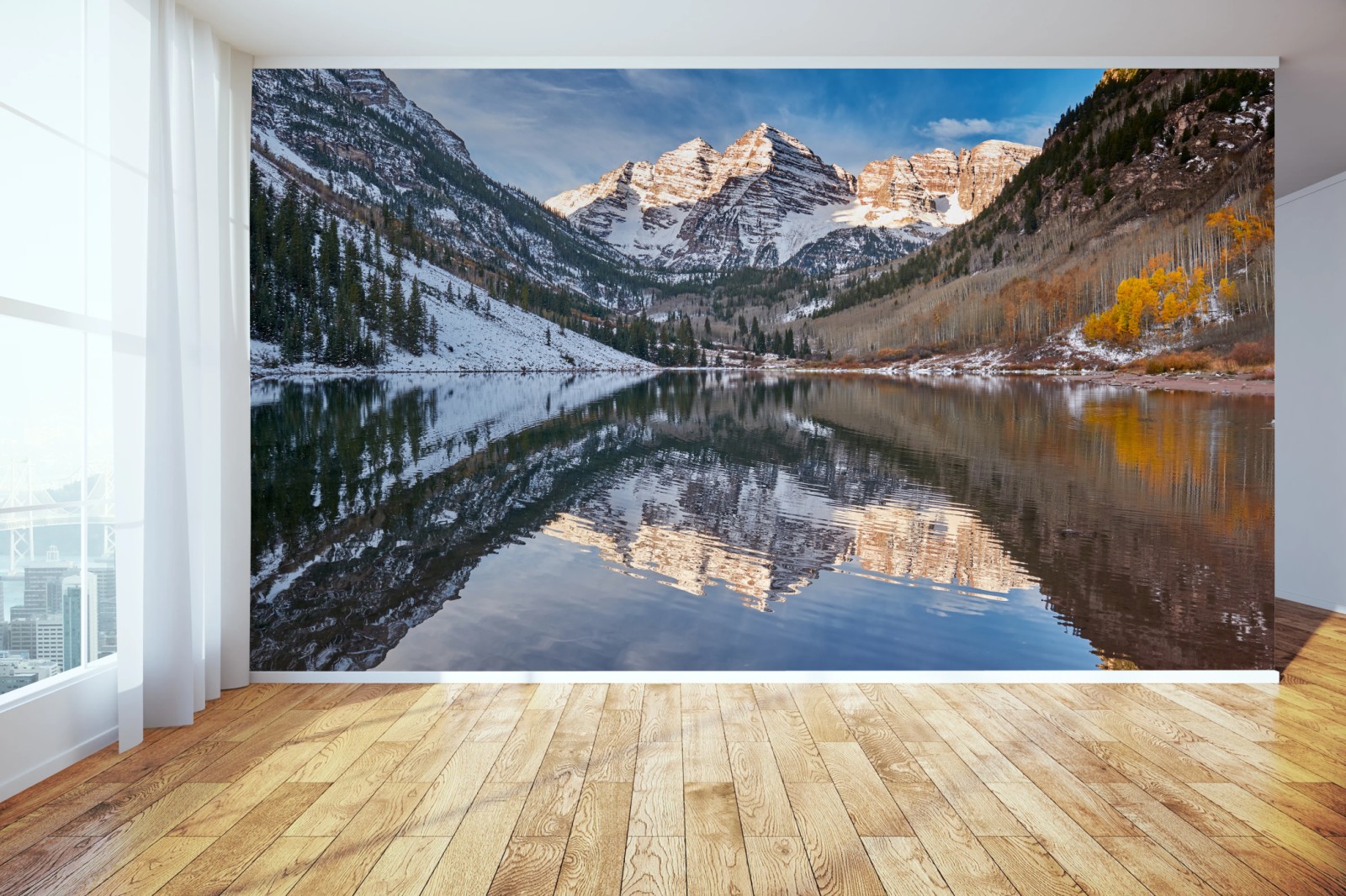 Fototapete Ruhiger alpensee, der schneebedeckte gipfel und bunte herbstbäume spiegelt
