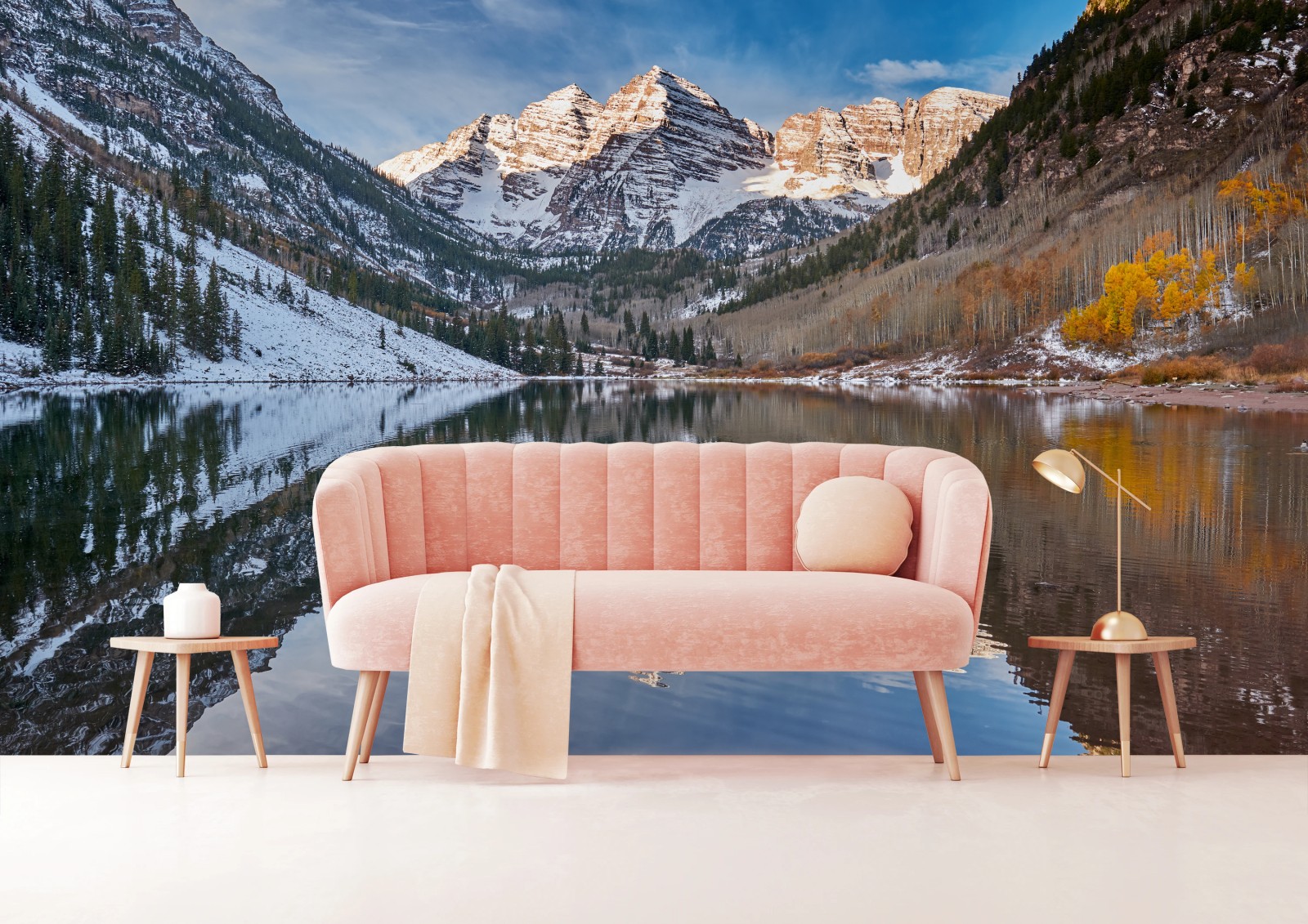 Fototapete Ruhiger alpensee, der schneebedeckte gipfel und bunte herbstbäume spiegelt