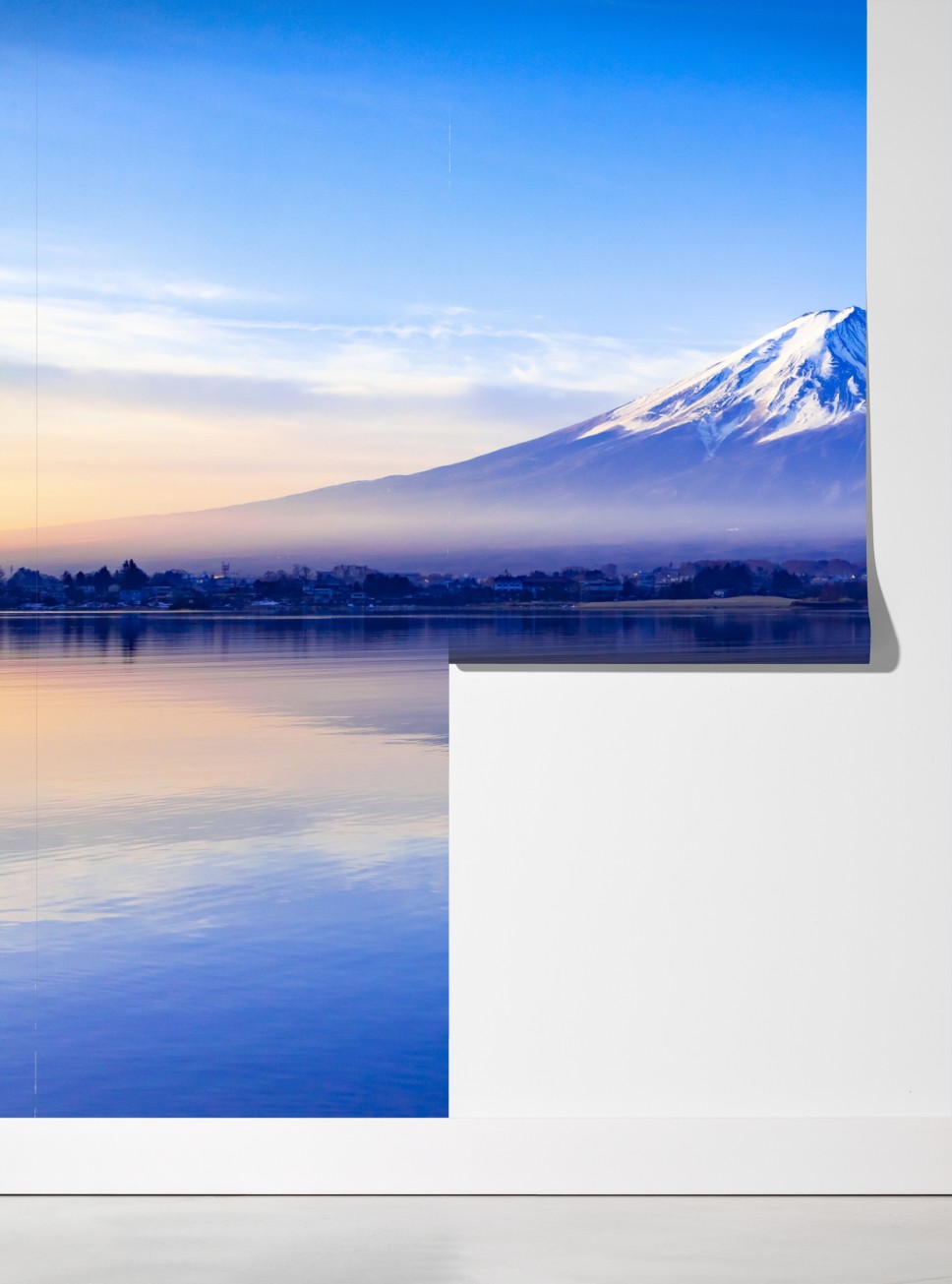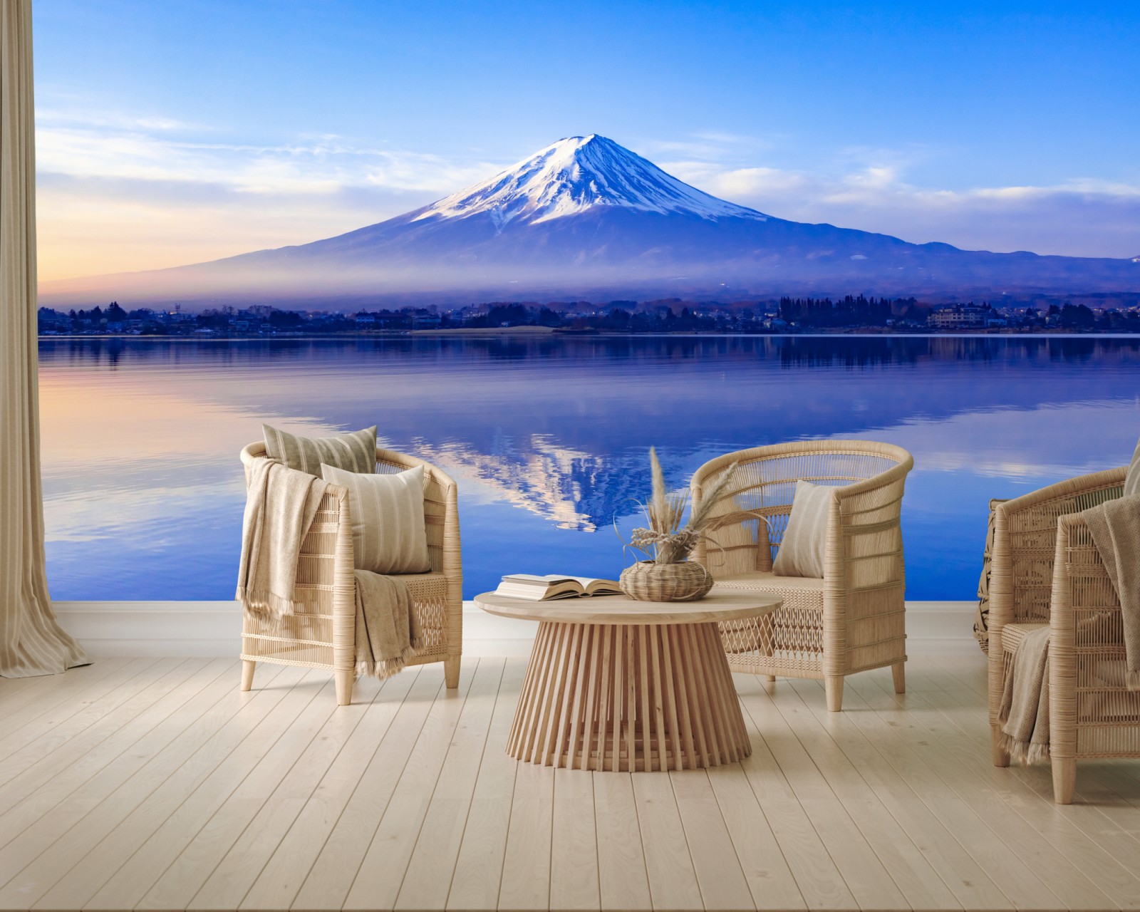 Ruhige Ansicht des Mount Fuji, der sich am Morgen im stillen See spiegelt und natürliche Gelassenheit an Ihre Wände bringt.