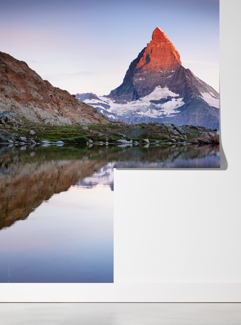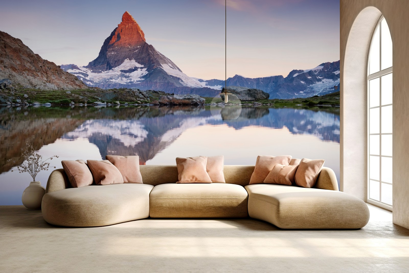 Ruhige Aussicht auf das Matterhorn, das sich bei Sonnenaufgang im stillen Alpensee spiegelt, ideal um natürliche Schönheit und Ruhe ins Zuhause zu holen.