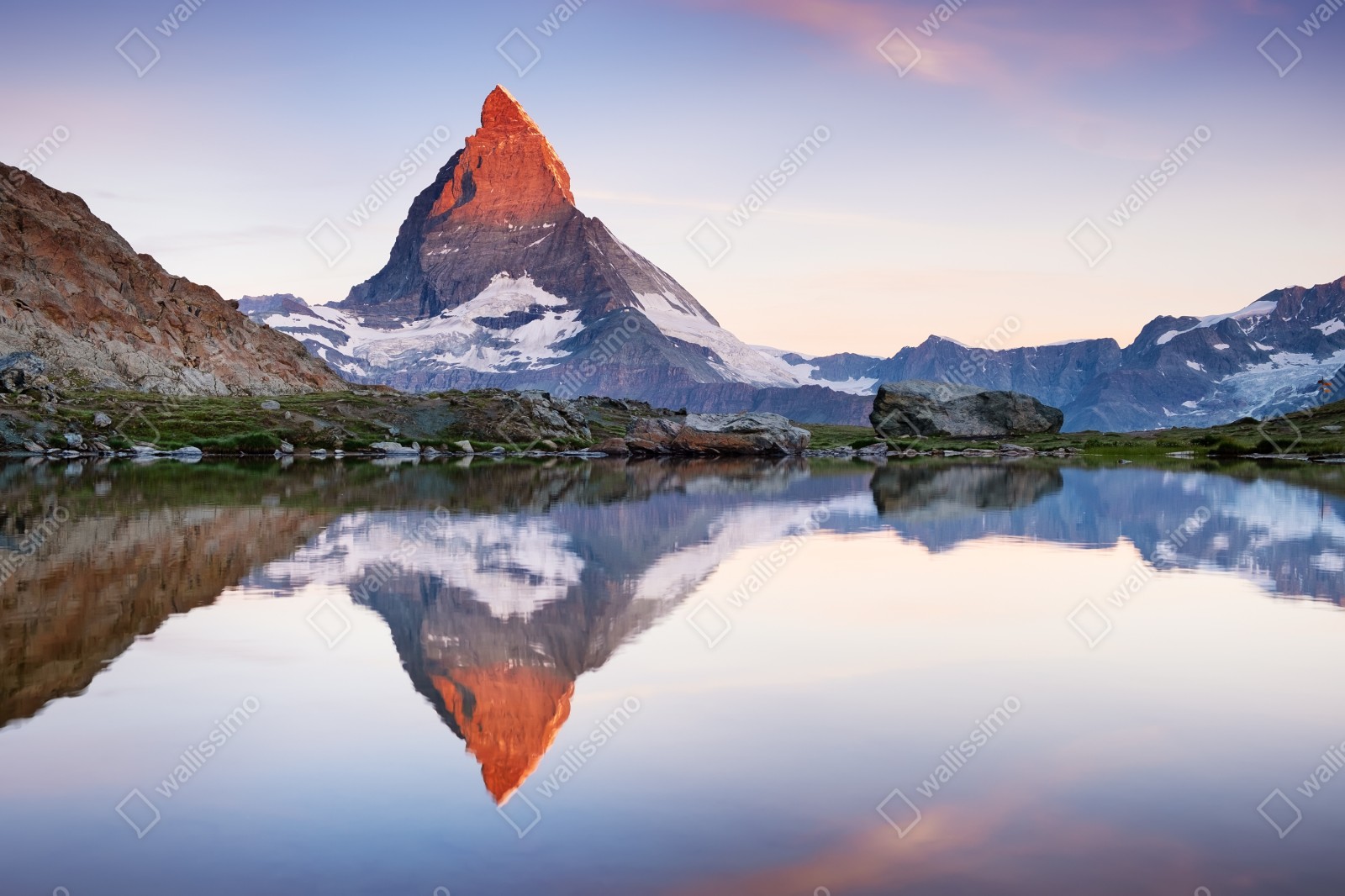 Fototapete Matterhorn bei sonnenaufgang über dem alpensee