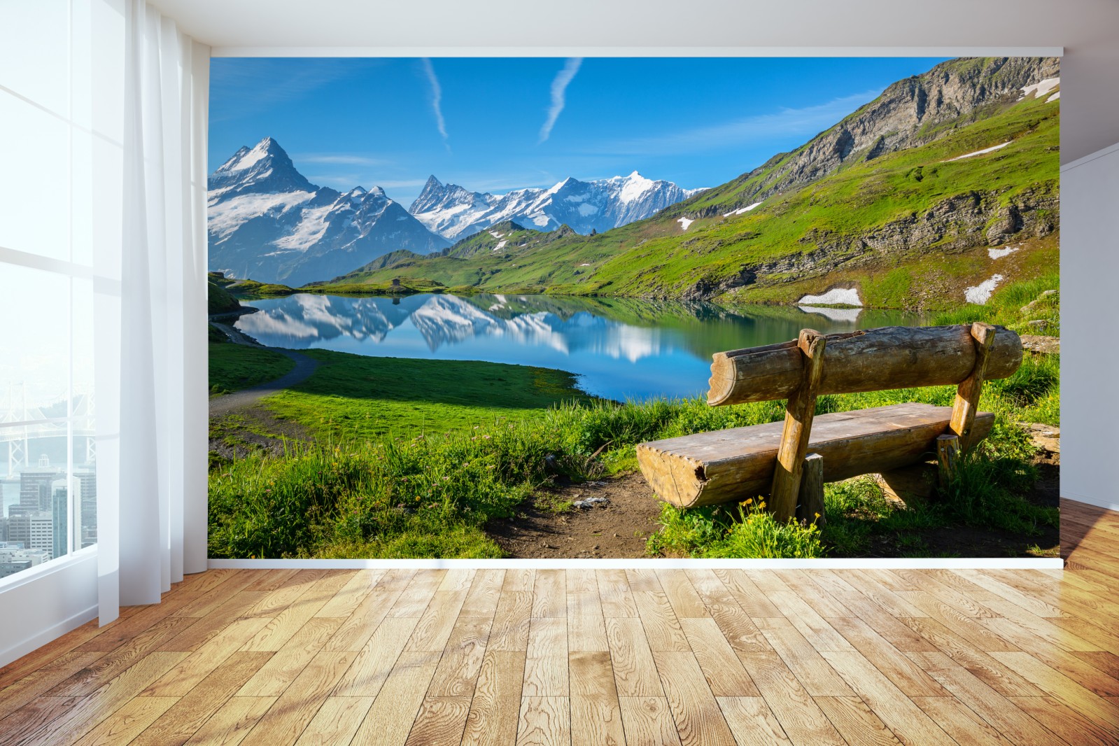 Fototapete alpensee mit hölzerner bank – Wallnifity®