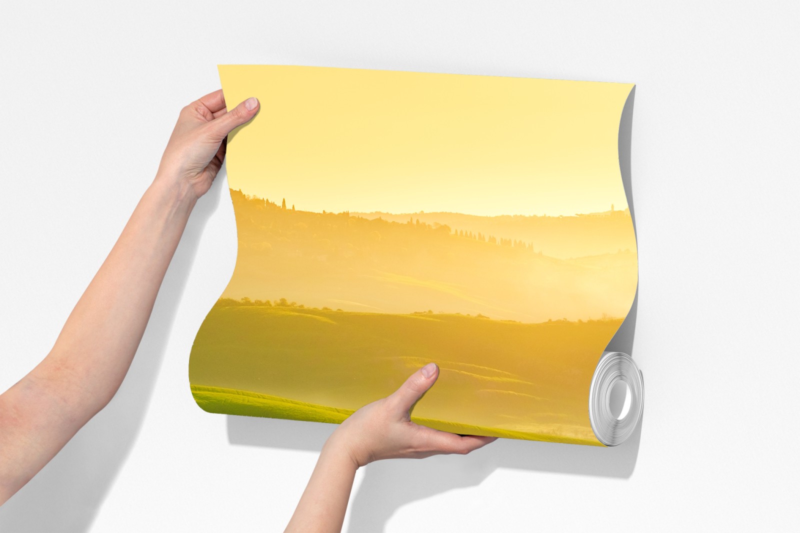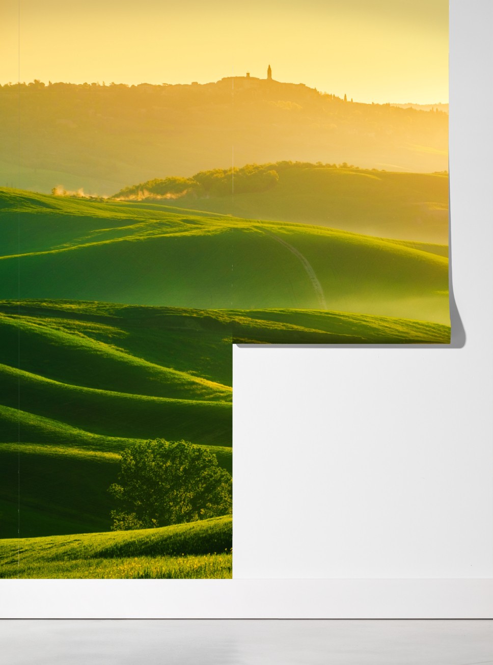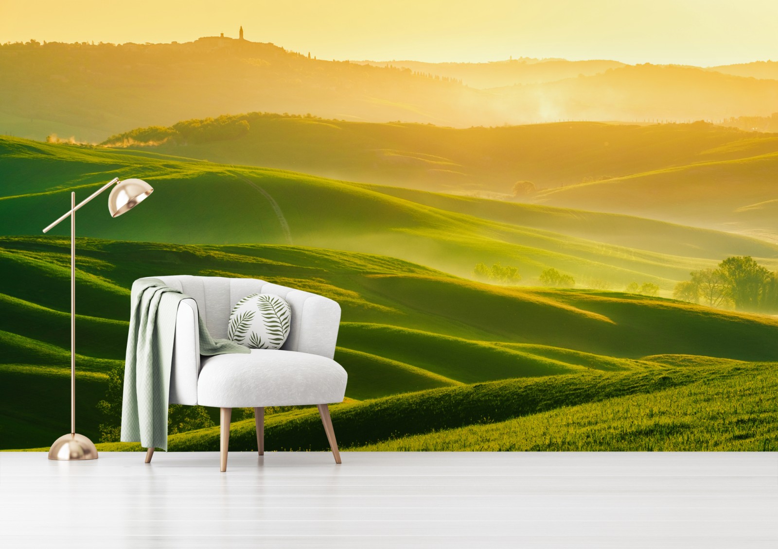 Fototapete goldener sonnenaufgang über sanften grünen hügeln – Wallnifity®