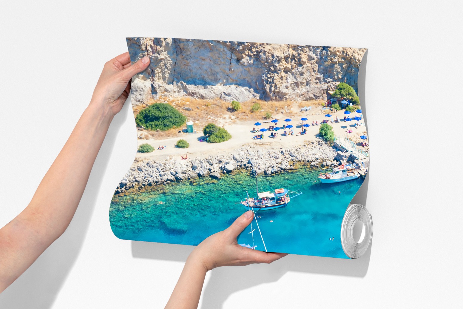 Bringen Sie das leuchtende türkisfarbene Wasser der Anthony Quinn Bucht in Rhodos in Ihr Zuhause mit dieser beeindruckenden Luftaufnahme, die jedem Raum ein mediterranes Flair verleiht.