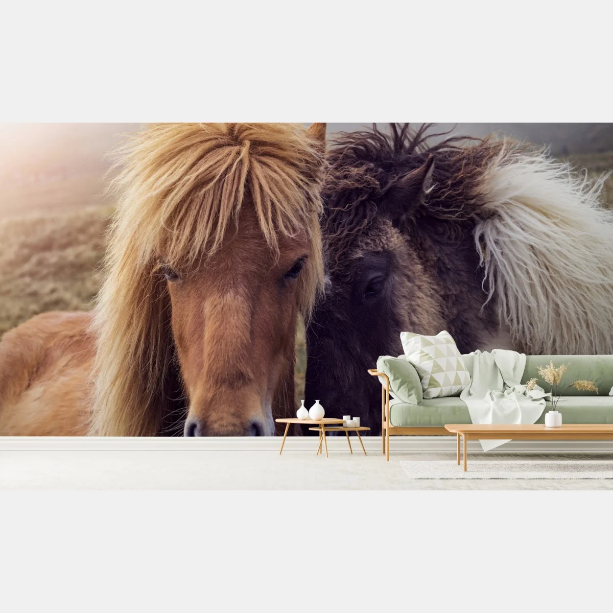 Fototapete Zwei pferde auf einem nebligen hügel, Färöer-Inseln