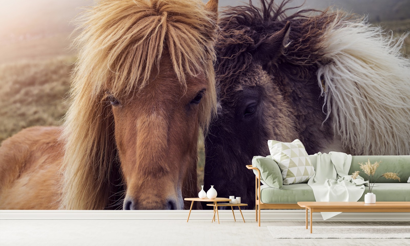 Eine Nahaufnahme von zwei Pferden auf den nebligen Färöer-Inseln, die rustikale Ruhe und natürliche Eleganz in Ihr Zuhause bringt.MehrWeniger