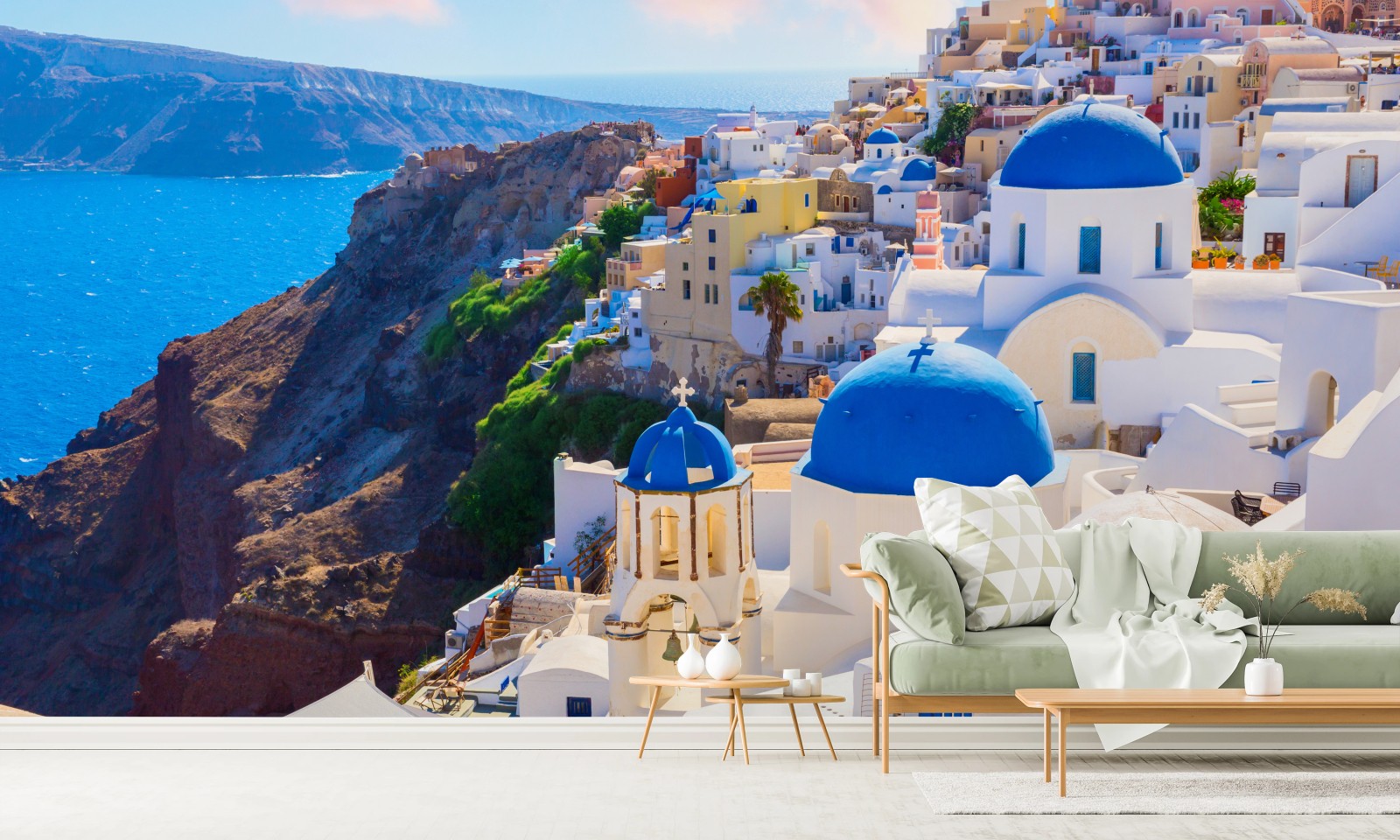 Fototapete Santorini blaue kuppeln und weiße häuser