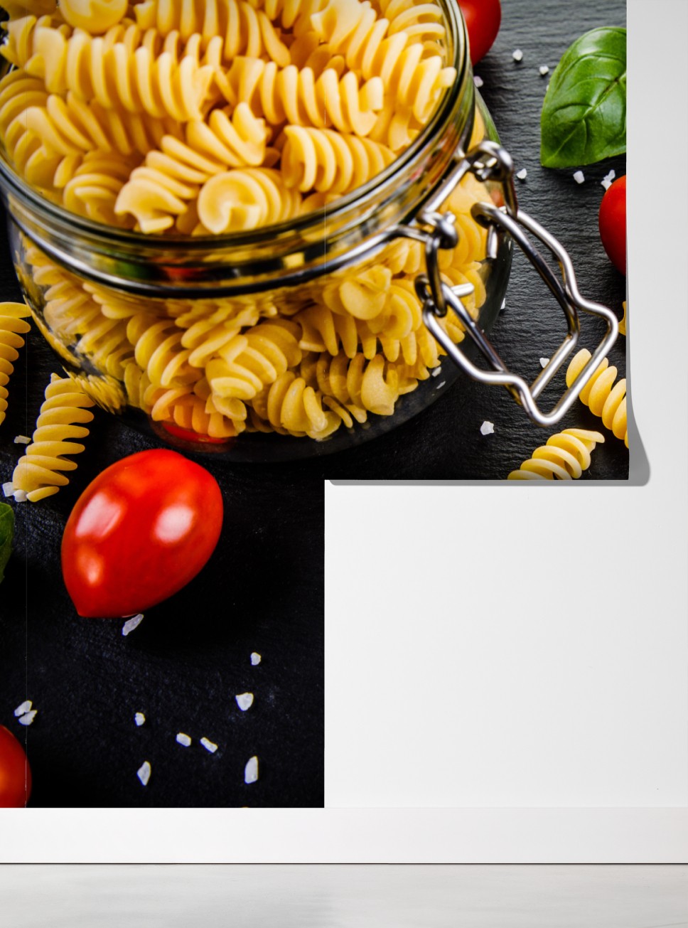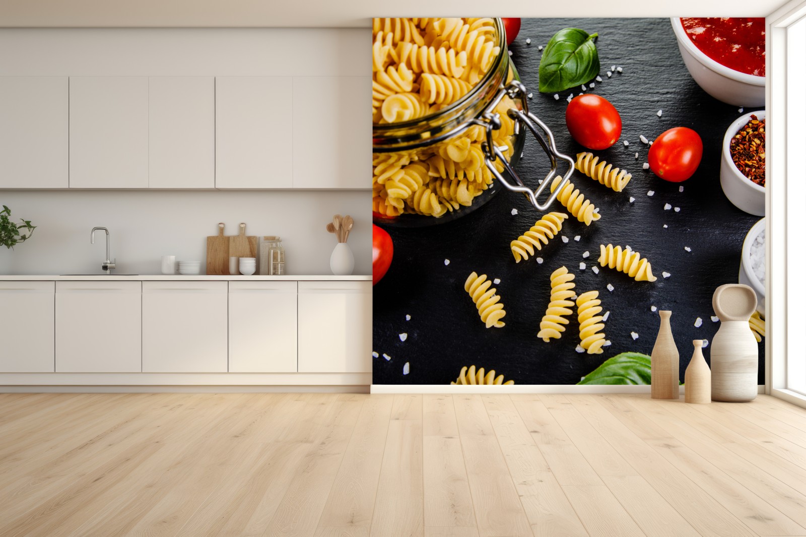 Lebhafte Food-Fotografie mit rohen Nudeln, Cherrytomaten, Basilikum und Gewürzen, perfekte Küchenwanddekoration, die kulinarische Inspiration vermittelt.