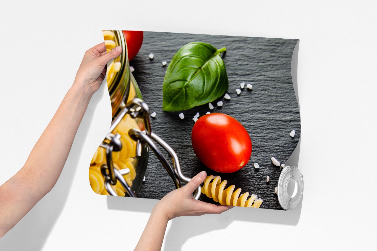 Fototapete pasta zutaten arrangiert mit tomaten und basilikum
