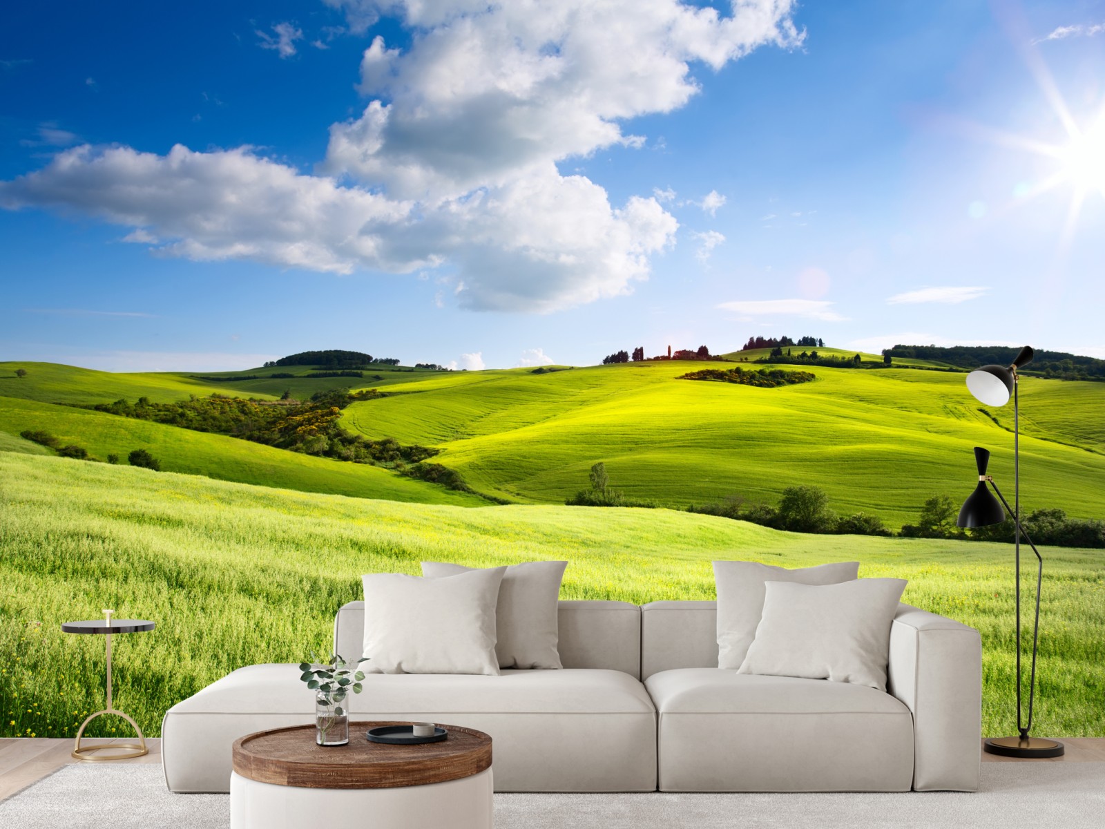Bringen Sie Ruhe in Ihr Zuhause mit einem lebendigen Blick auf die sanften Hügel der Toskana im warmen Licht des Sonnenuntergangs.