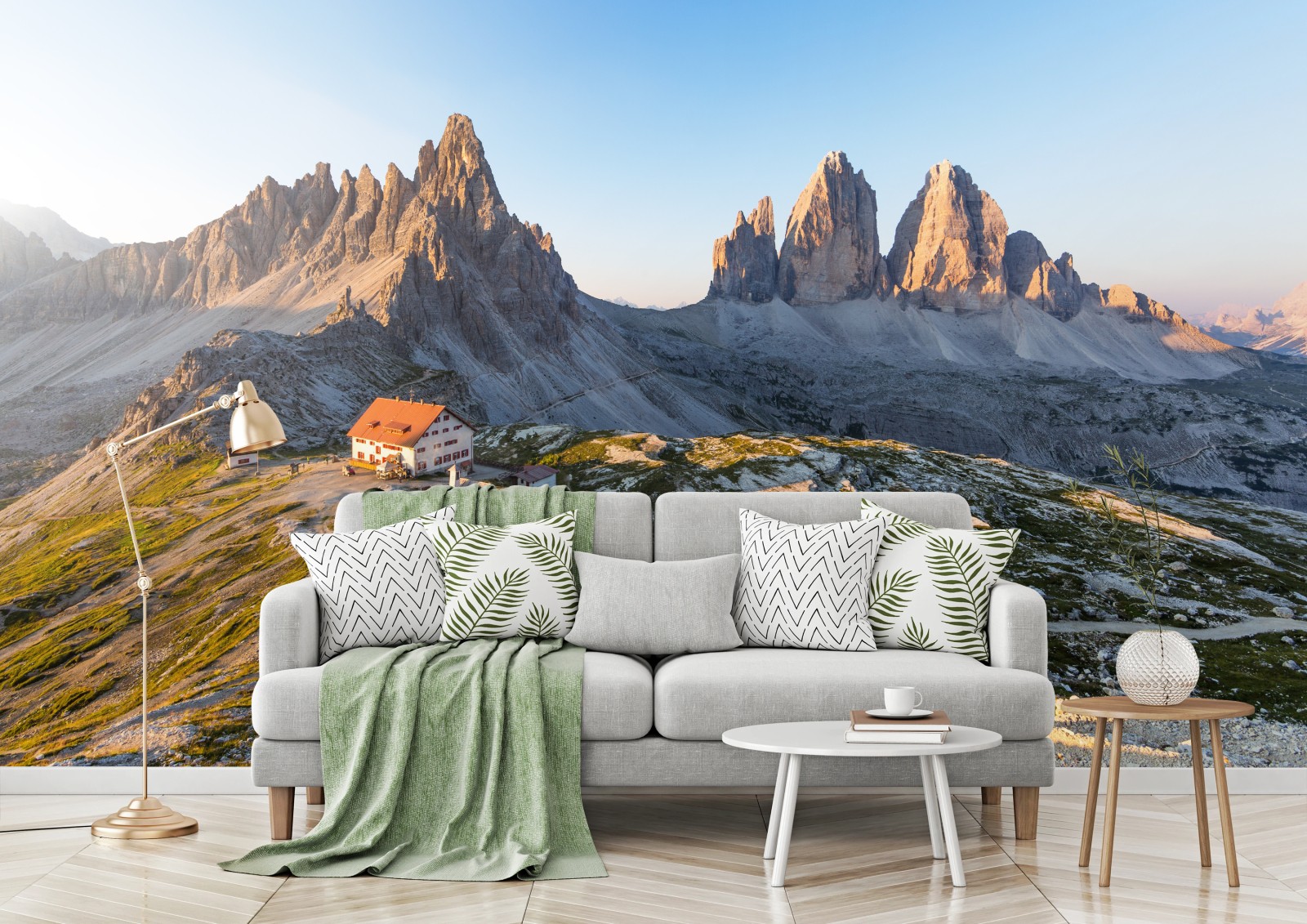 Fototapete Sonnenbeschienene berghütte und alpine gipfel