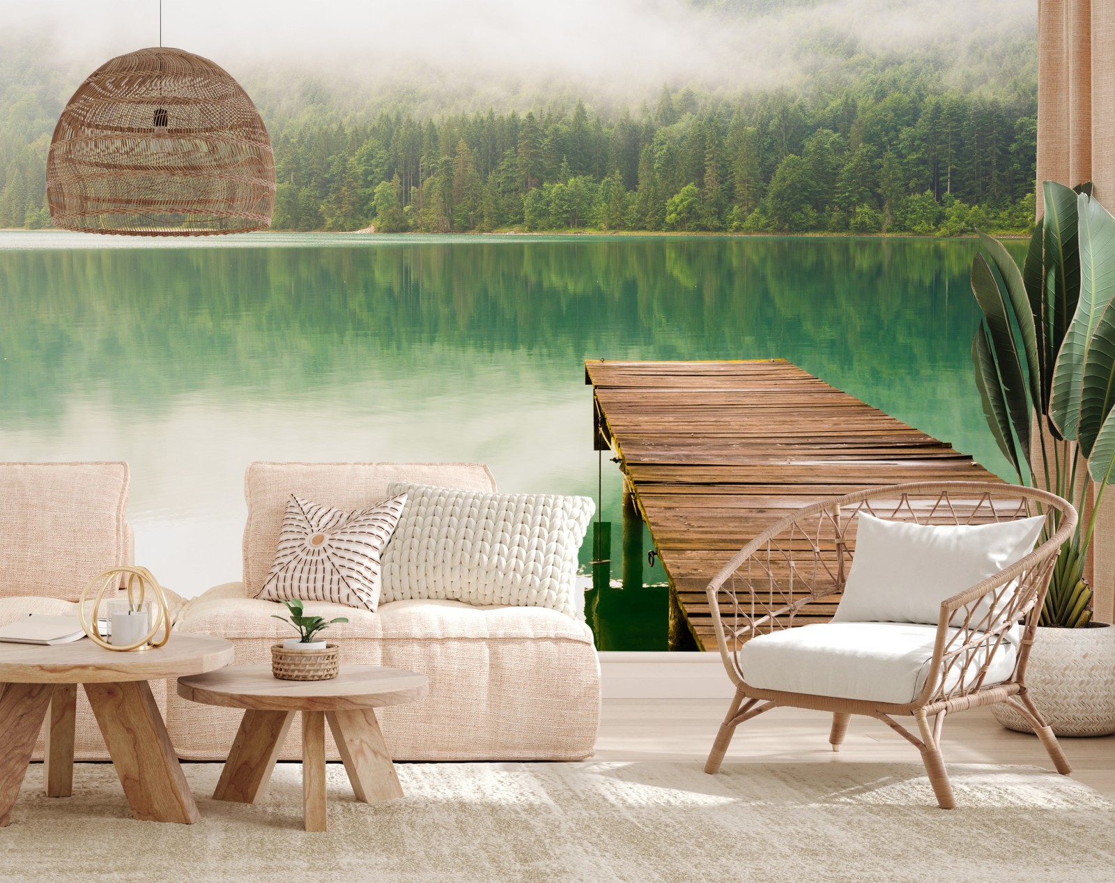 Fototapete Nebliger see mit hölzernem steg