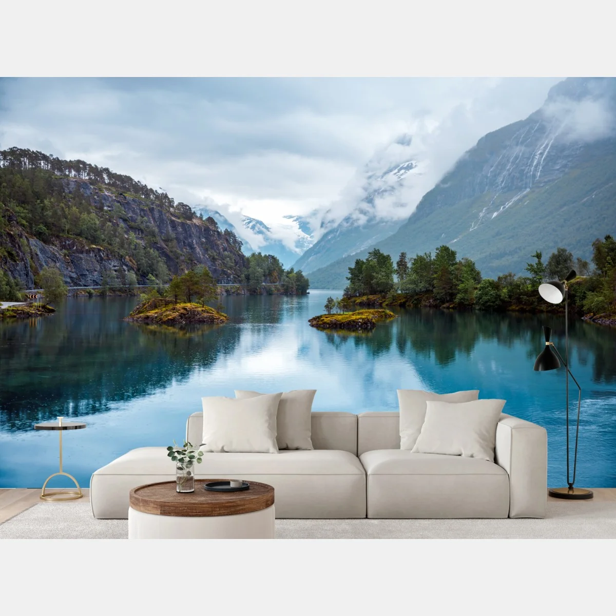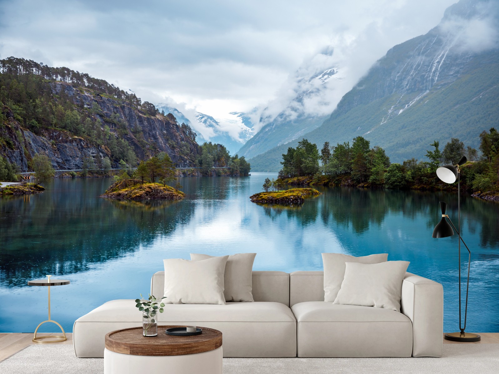 Fototapete Lovatnet see mit spiegelung in nebeligen bergen Norwegens