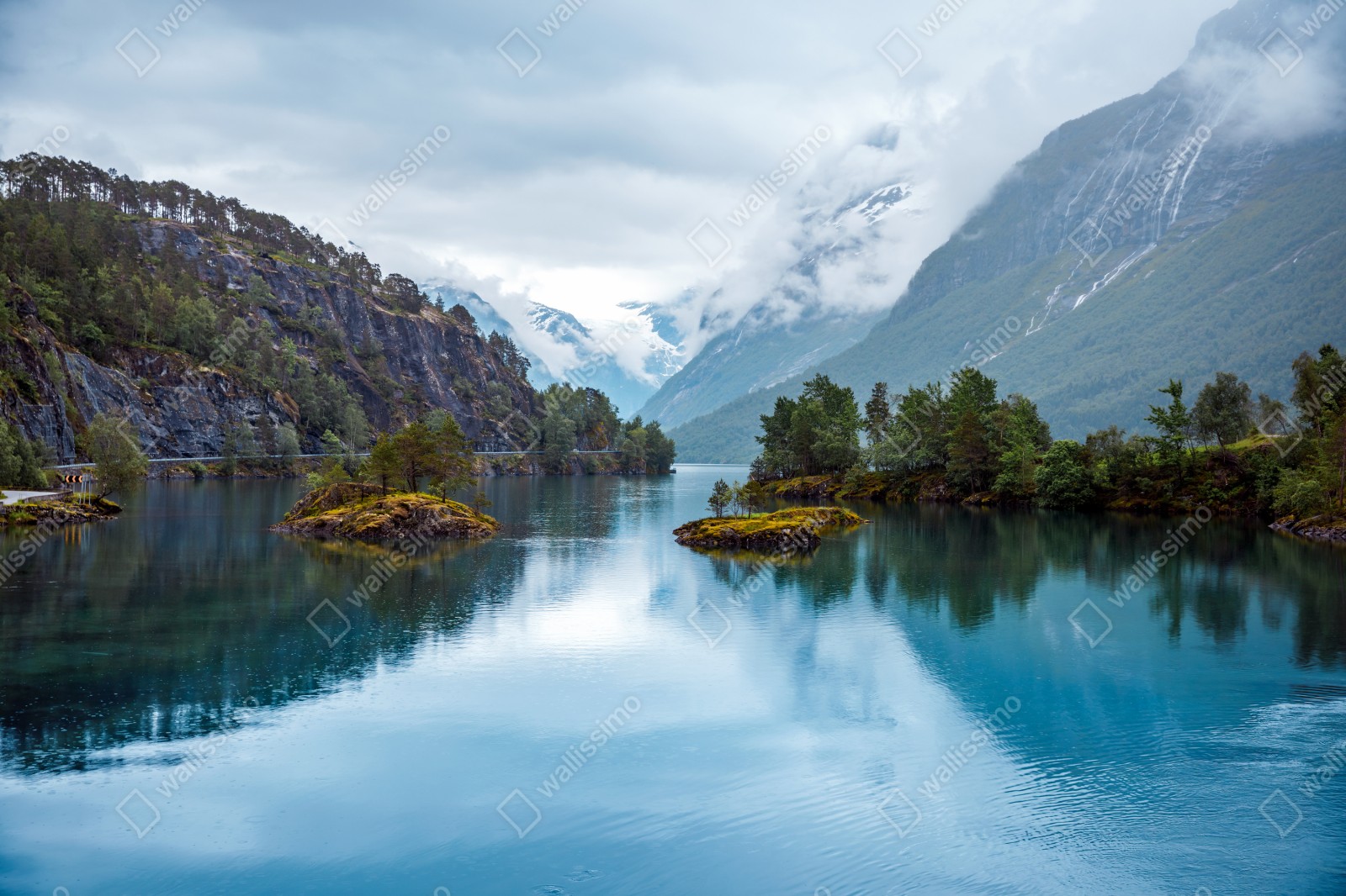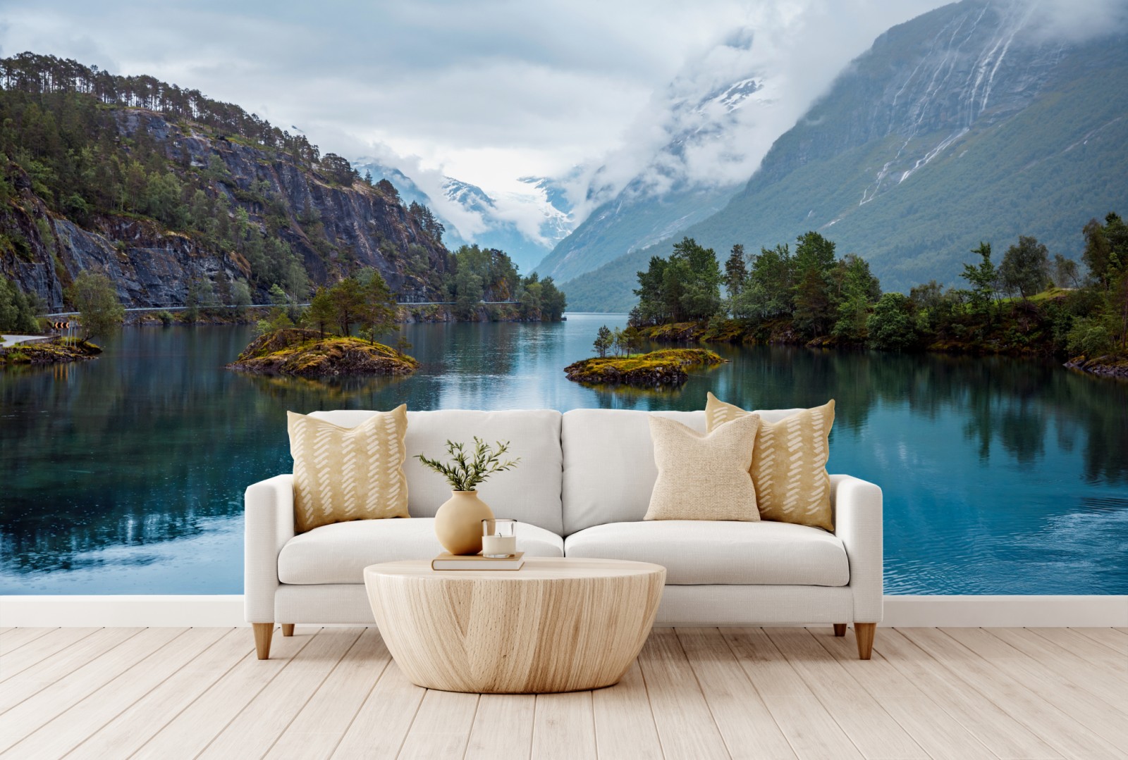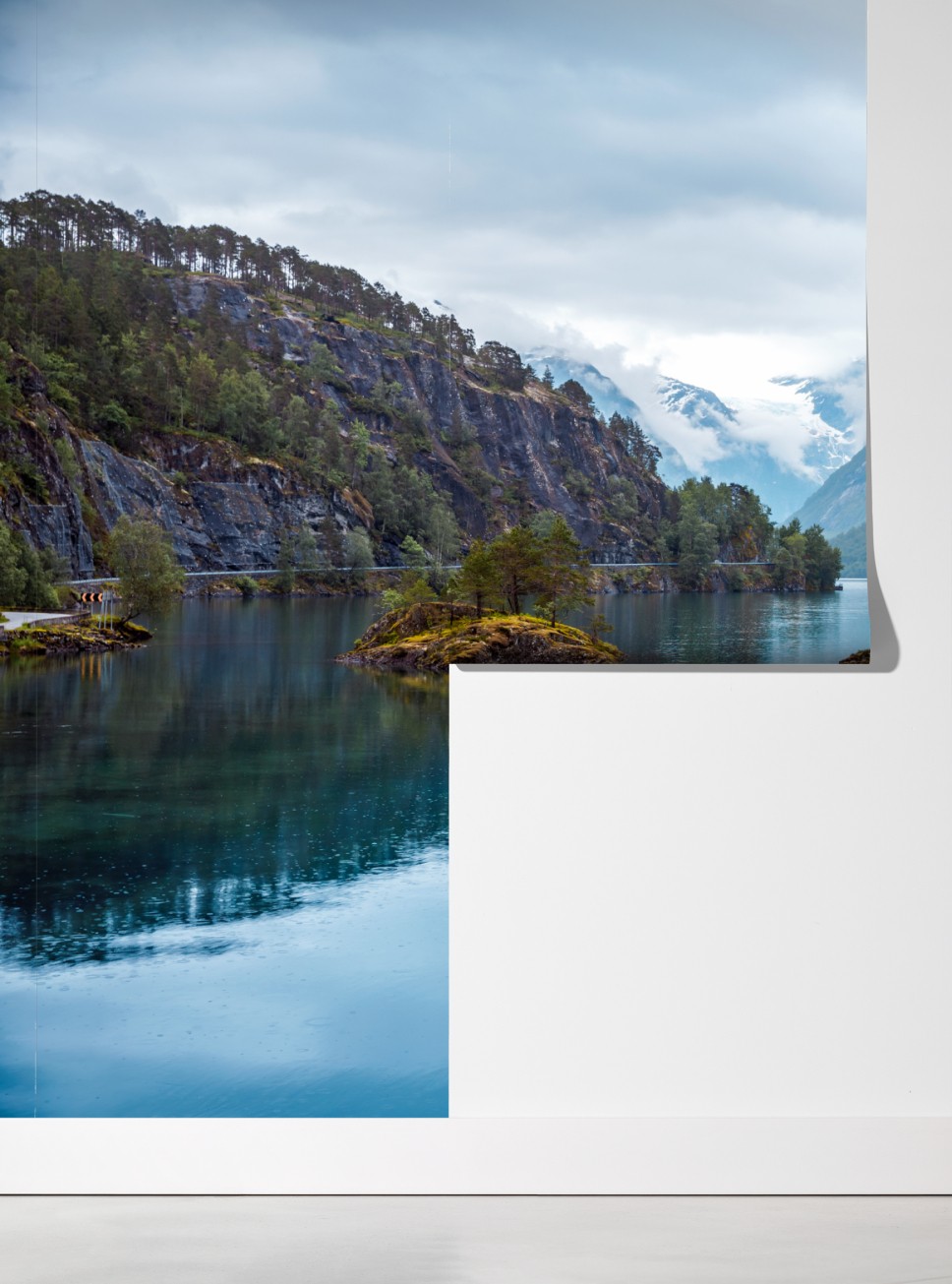 Bringen Sie nordische Ruhe in Ihr Zuhause mit diesem Landschaftsbild von Lovatnet: türkisblaues Wasser, nebelverhangene Berge und ruhige Inseln.