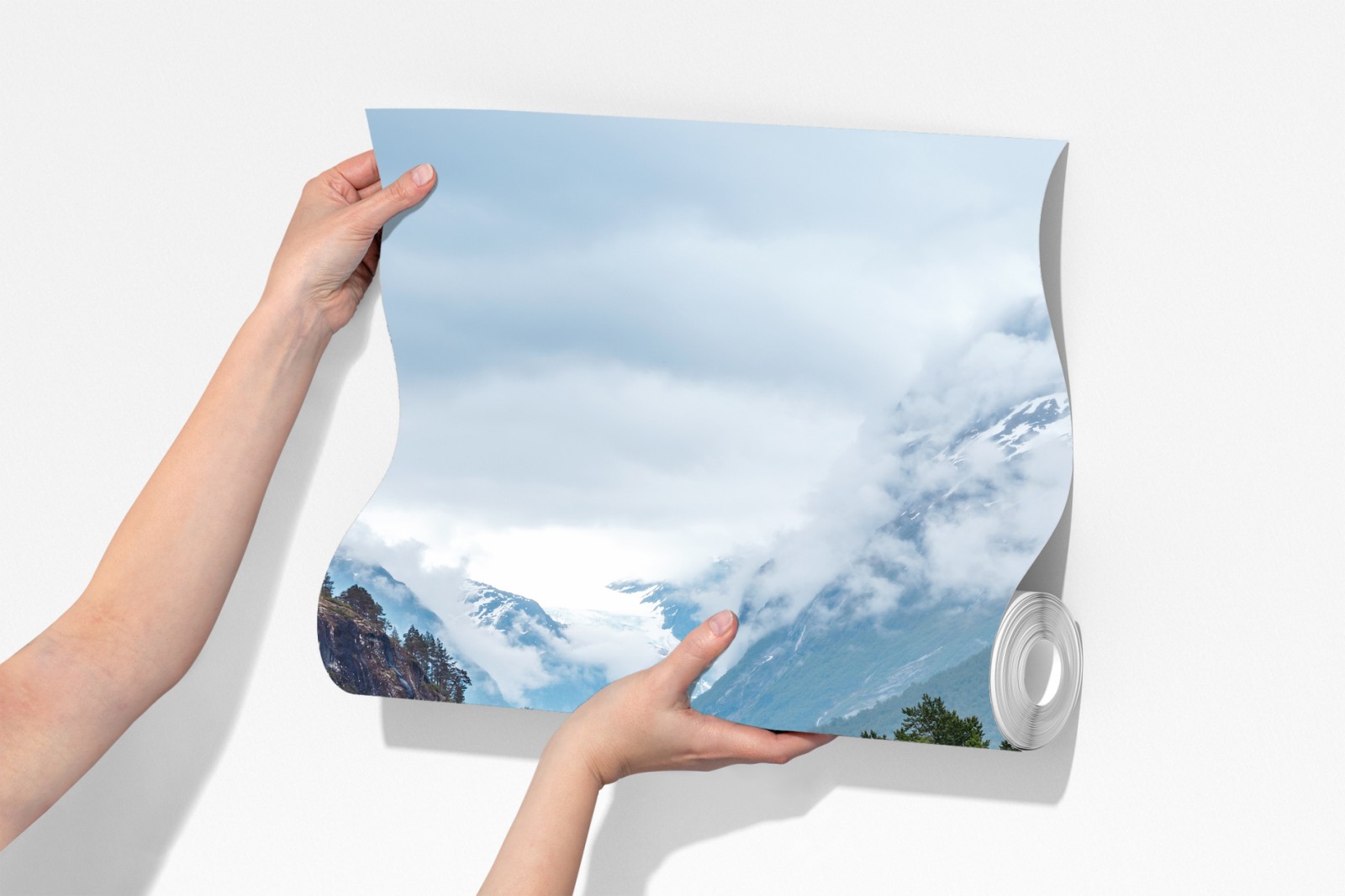 Fototapete Lovatnet see mit spiegelung in nebeligen bergen Norwegens – Wallnifity®