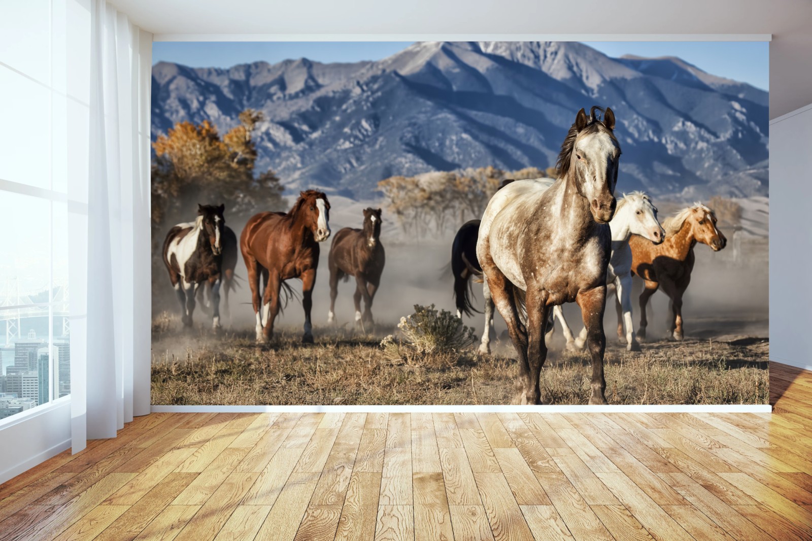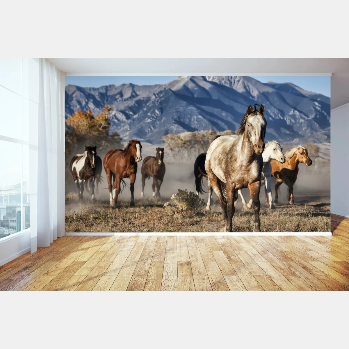 Fototapete Wilde pferde galoppieren auf gebirgswiese
