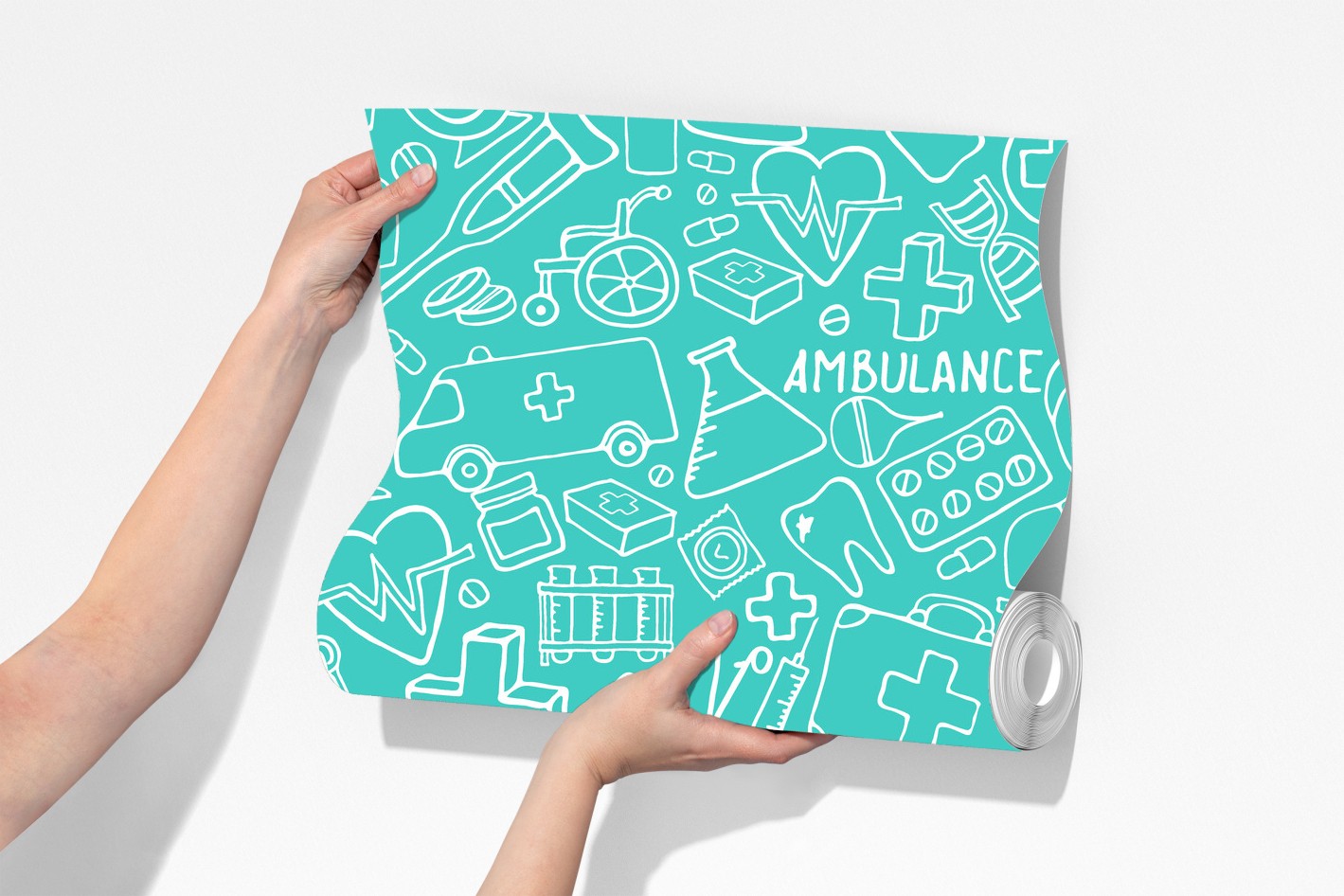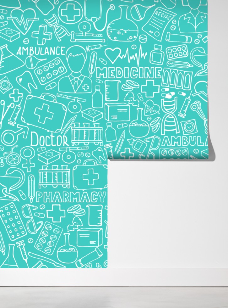 Verspieltes türkisfarbenes nahtloses Muster mit medizinischen Icons verleiht Wänden ein modernes Gesundheitsthema, ideal für Kinderzimmer, Kliniken und Büros.