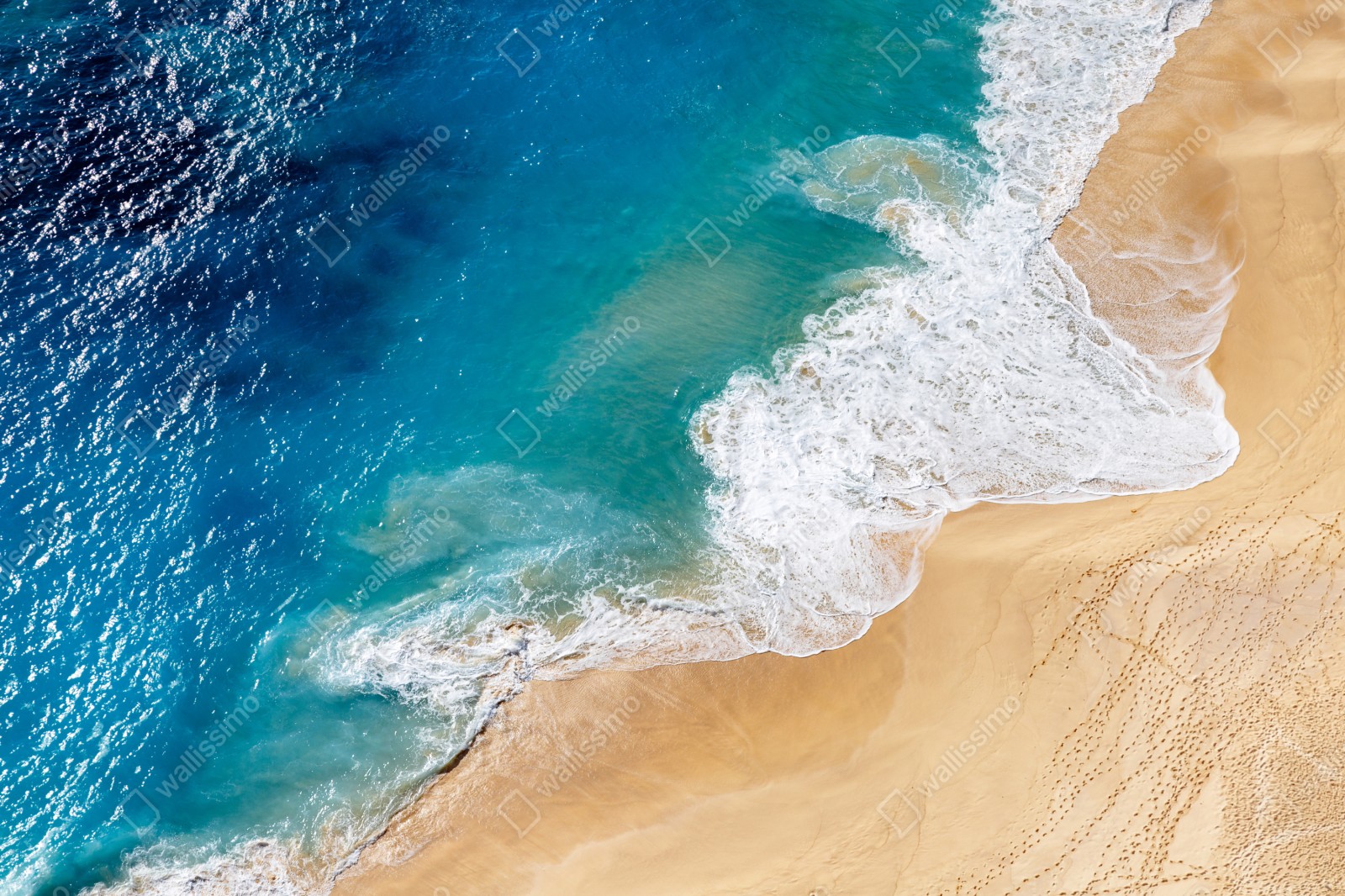 Beeindruckende Luftaufnahme einer tropischen Strandlandschaft mit türkisfarbenem Wasser und goldenem Sand, ideal um maritimen Flair ins Zuhause zu bringen.
