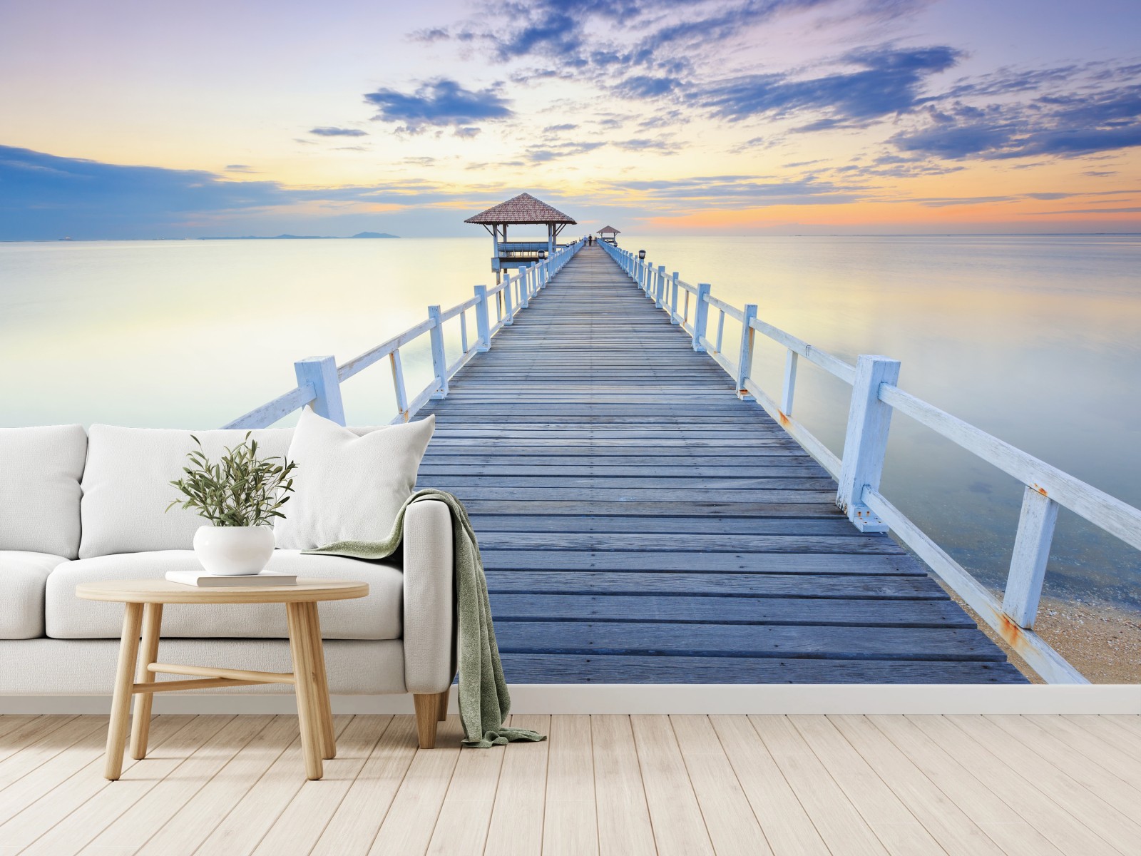 Fototapete Ruhiger hölzerner steg bei sonnenuntergang