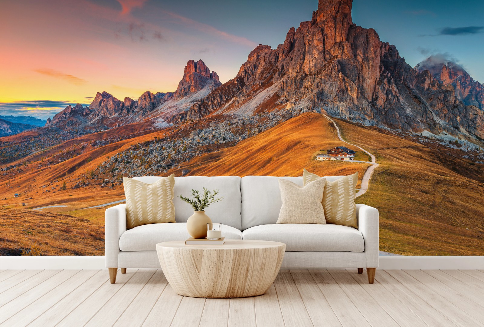Atemberaubender Sonnenuntergang über dem Passo Giau in den Dolomiten, ideal um warme Alpenstimmung in Ihr Zuhause zu bringen.MehrWeniger