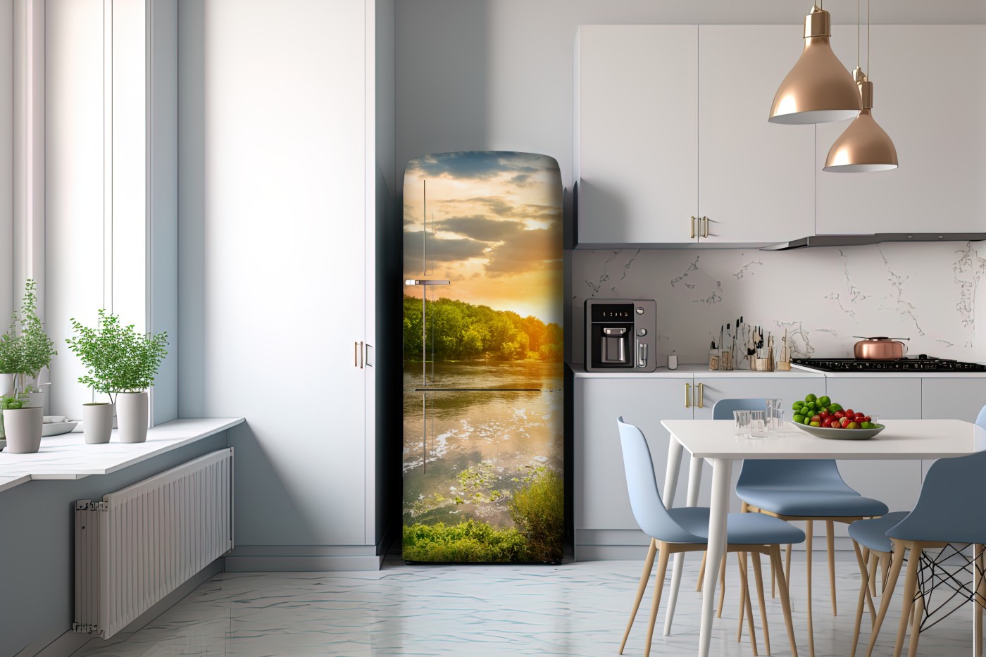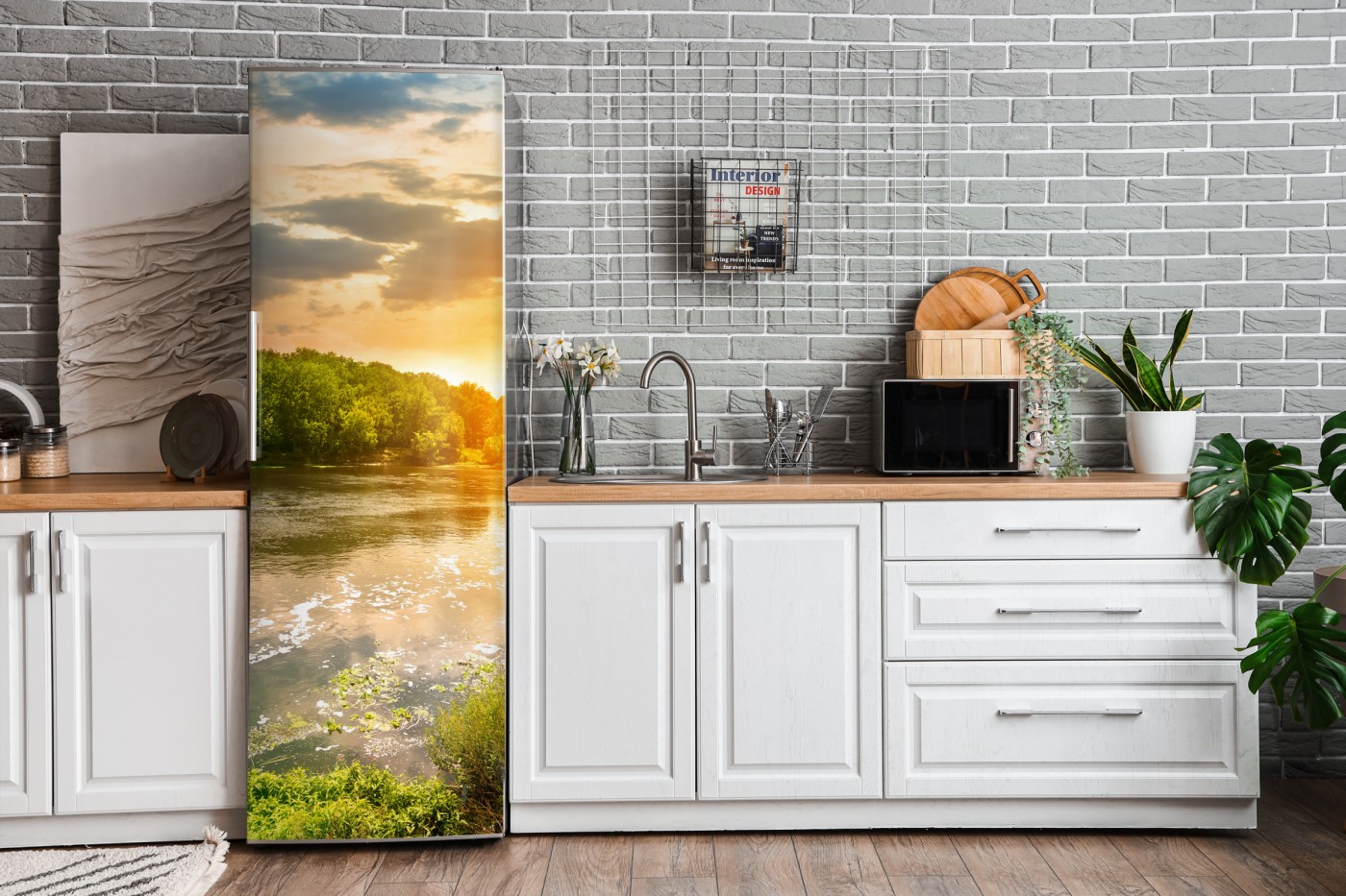 Kühlschrankaufkleber Ruhiger sonnenuntergang am fluss im grünen wald
