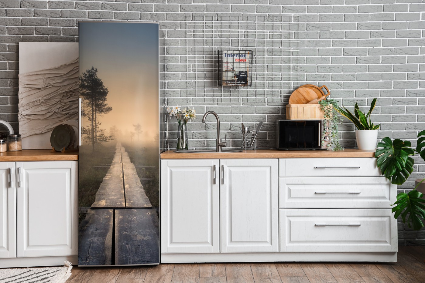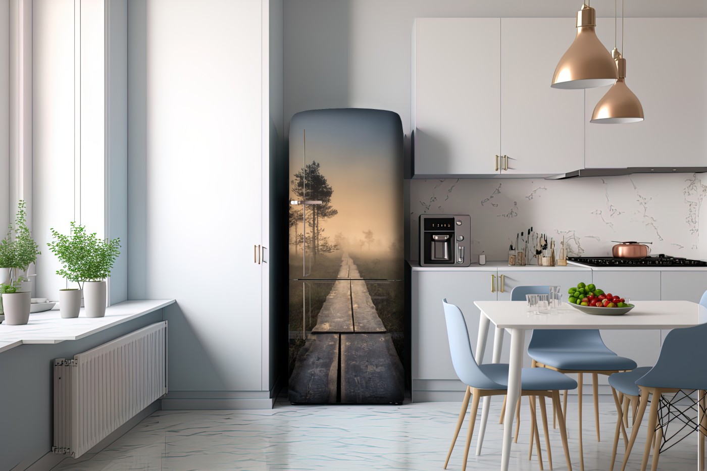 Kühlschrankaufkleber Nebliger sonnenaufgang über dem holzsteg