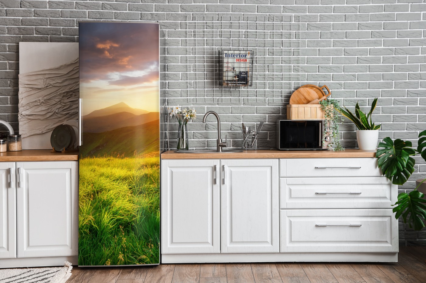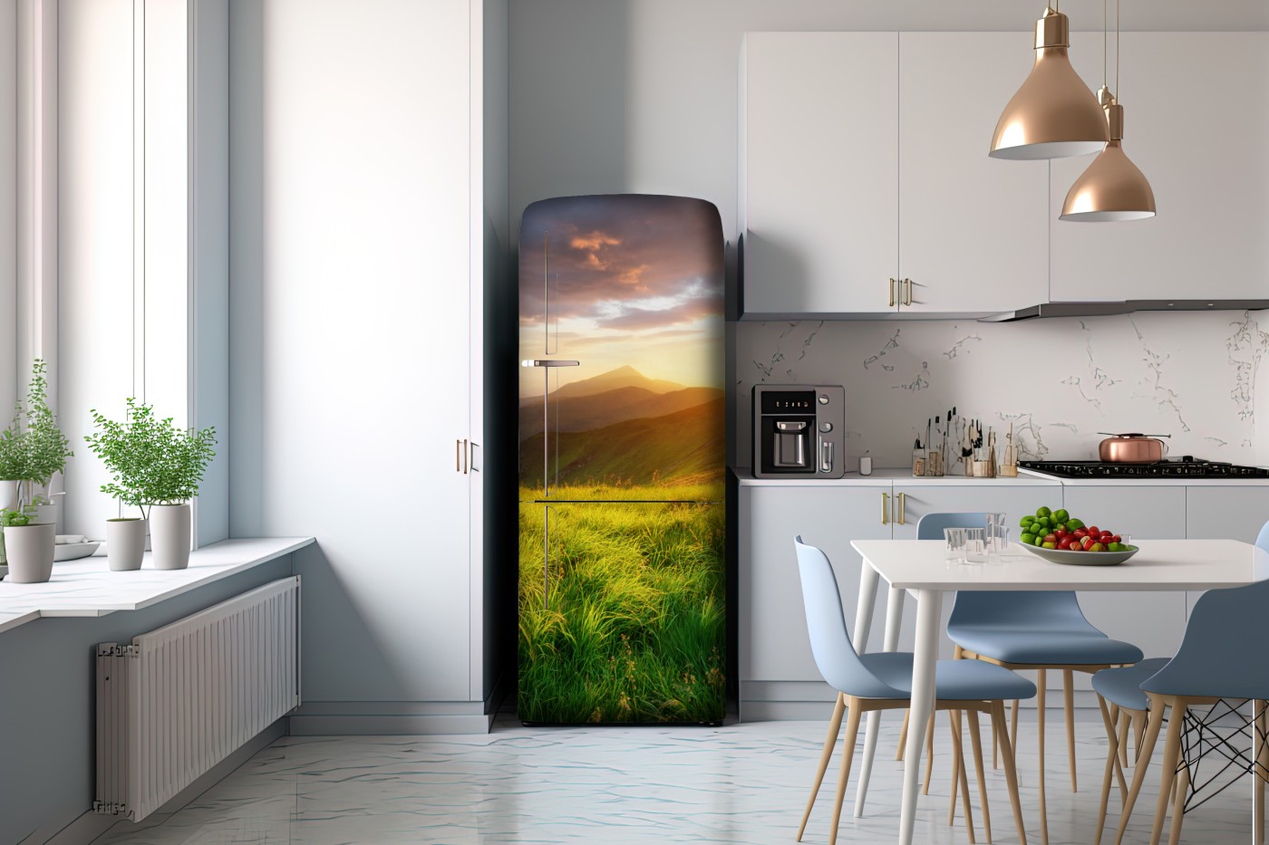 Kühlschrankaufkleber Sonnige bergwiese bei sonnenaufgang
