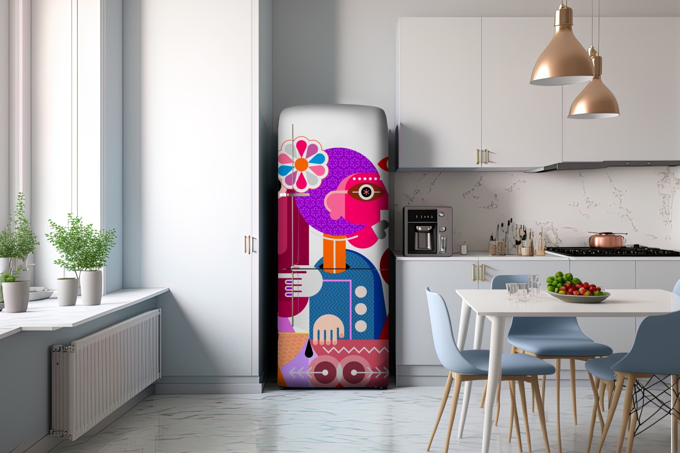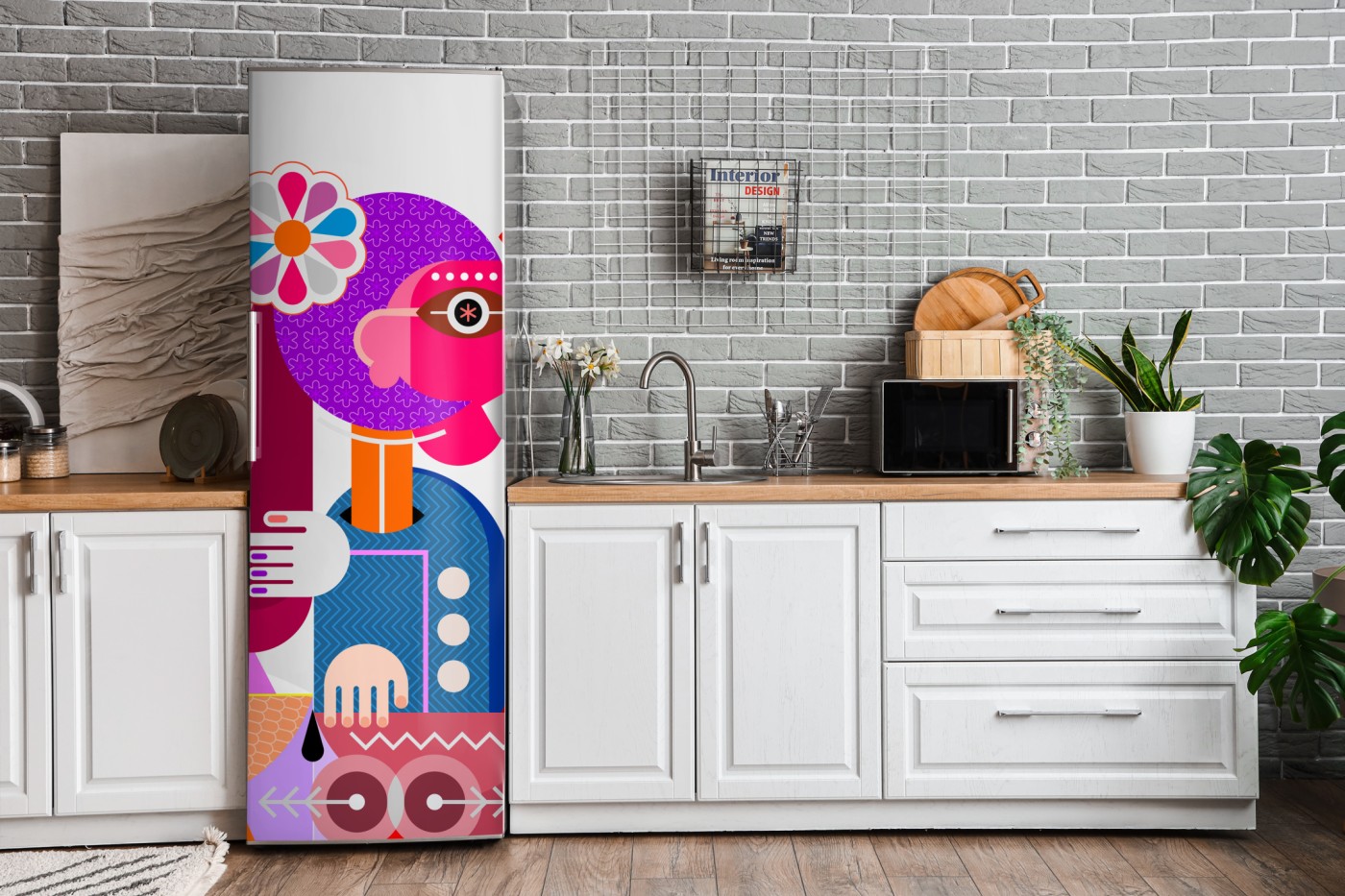 Kühlschrankaufkleber Mann mit regenbogen reitet geometrischen vogel