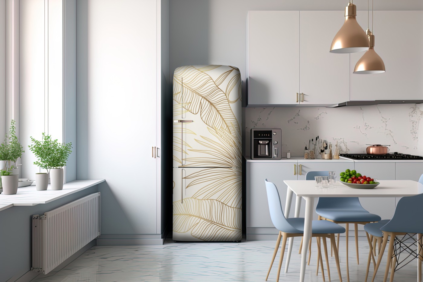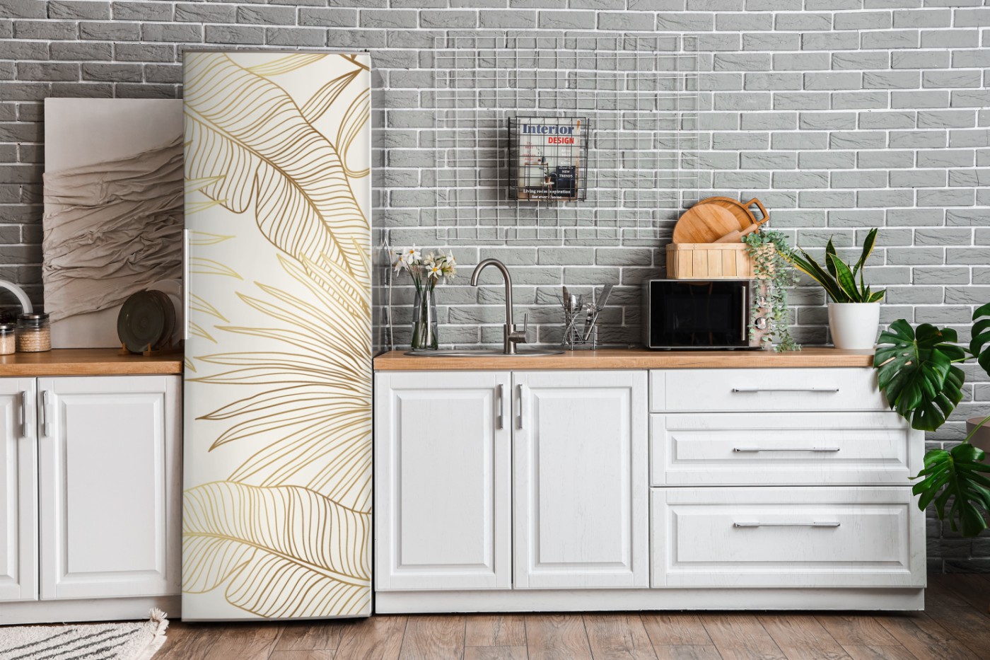 Kühlschrankaufkleber Goldene tropische blätter auf beigem hintergrund
