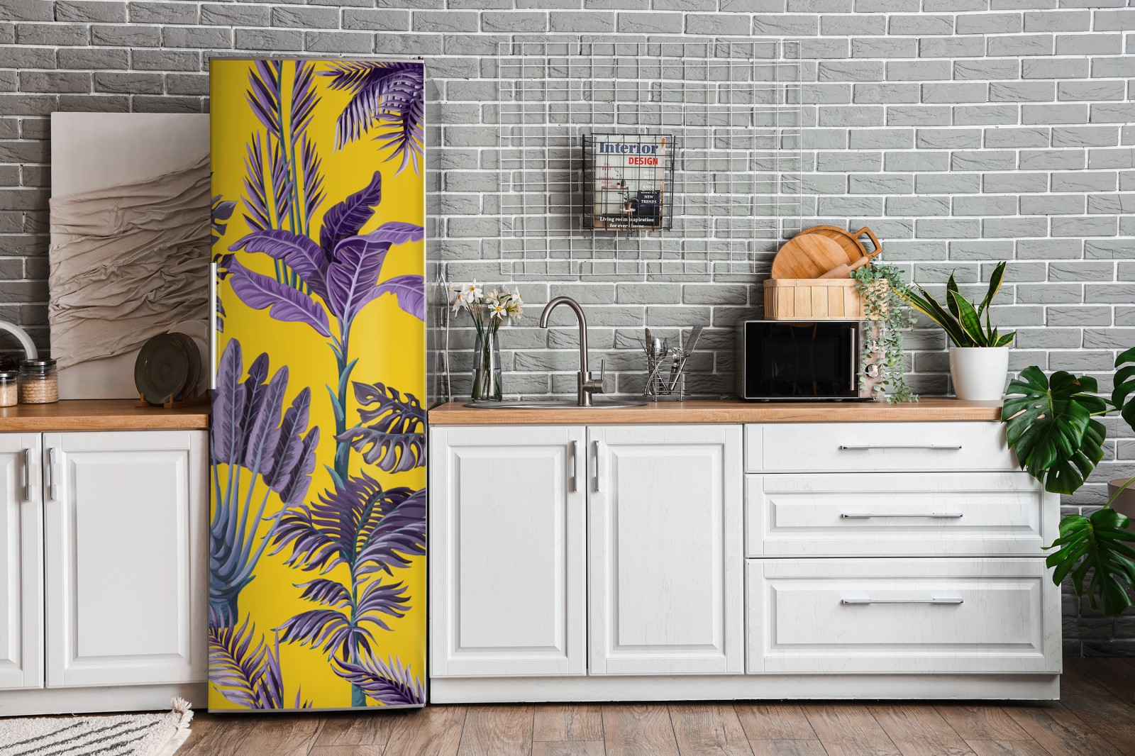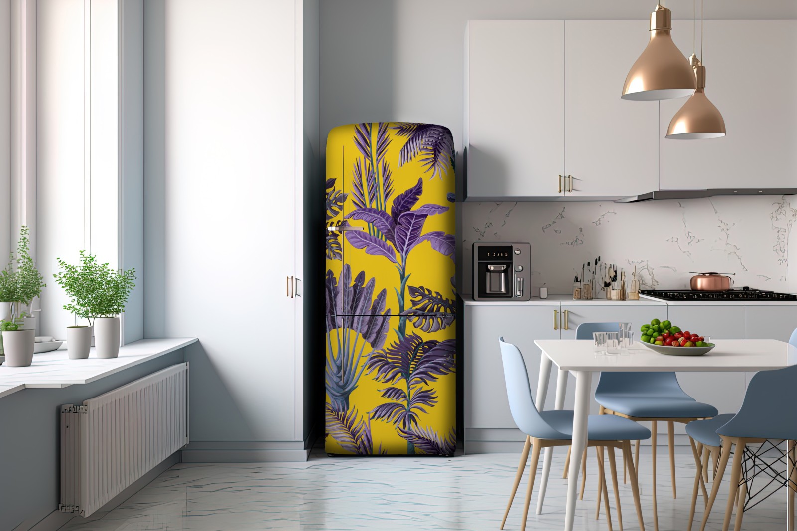 Kühlschrankaufkleber tropische lila blätter auf gelbem hintergrund