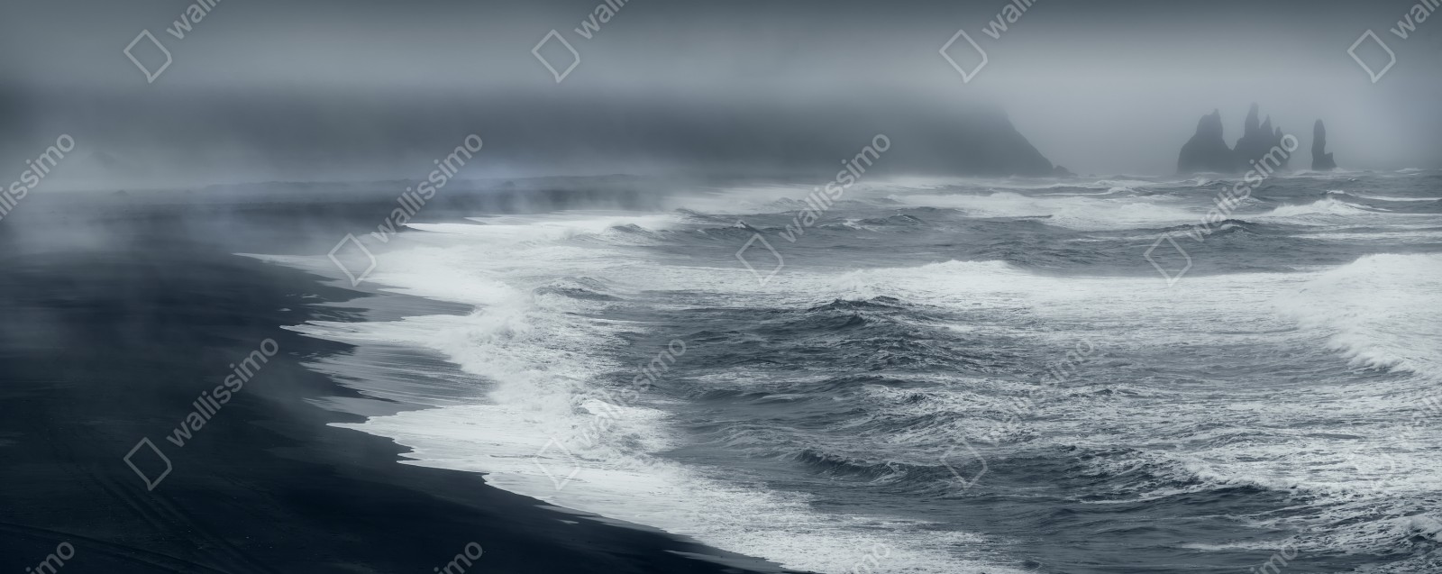 Bringen Sie dramatische Küstenenergie in Ihren Raum mit diesem Panorama eines stürmischen Vulkanstrandes in Island, das kraftvolle Wellen, schwarzen Sand und düstere, bewölkte Himmel zeigt.
