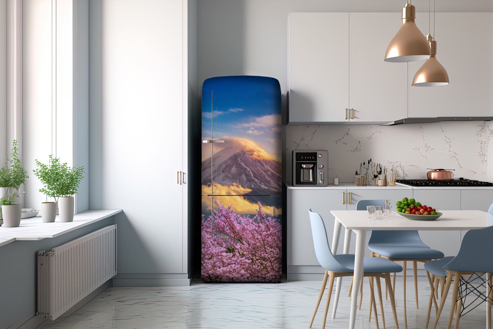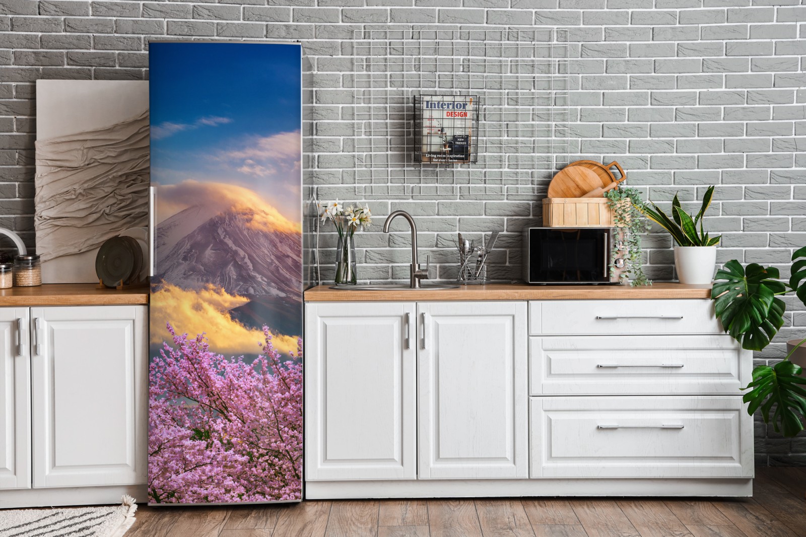 Kühlschrankaufkleber Berg Fuji mit blühenden kirschblüten bei sonnenaufgang