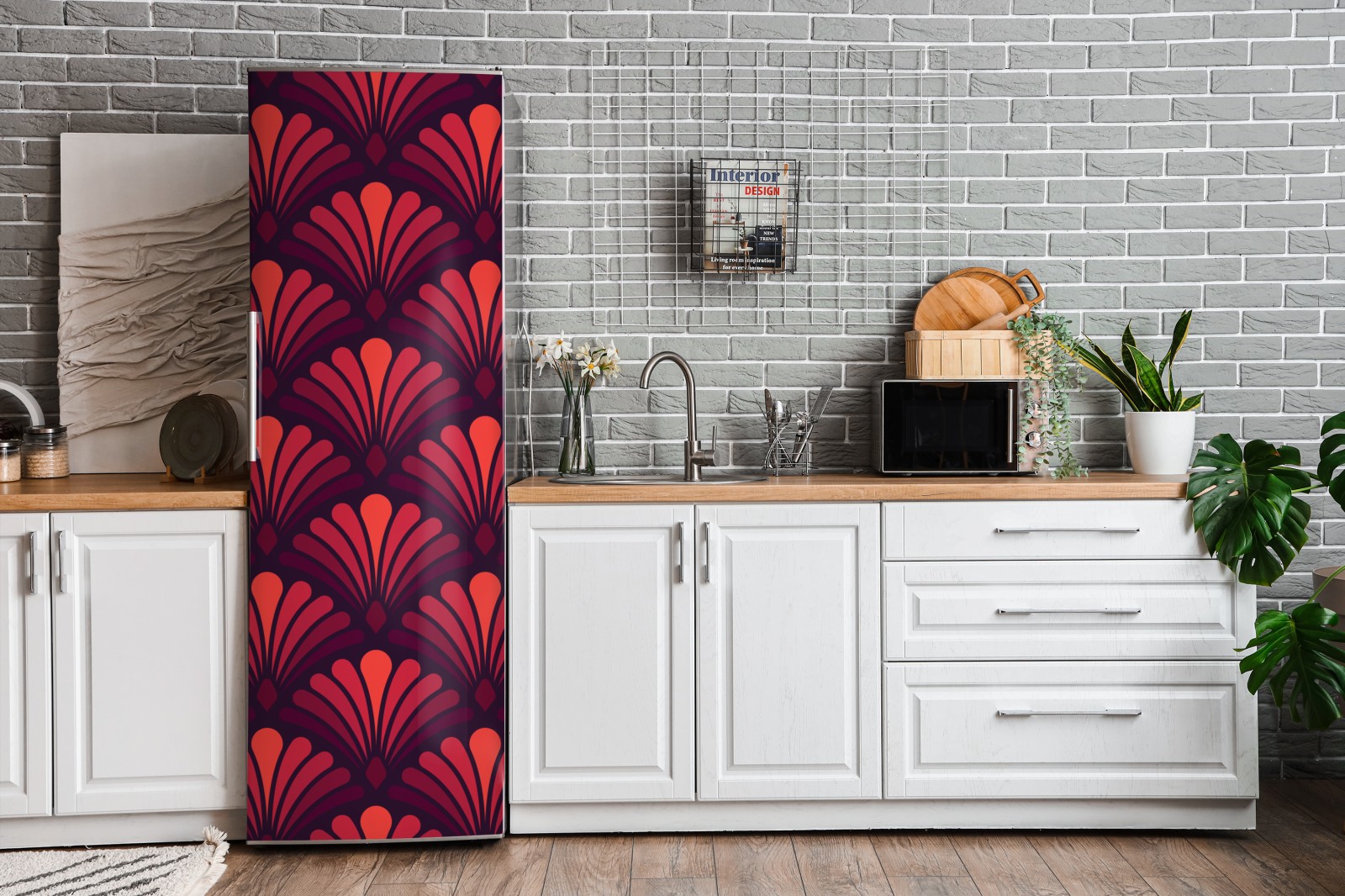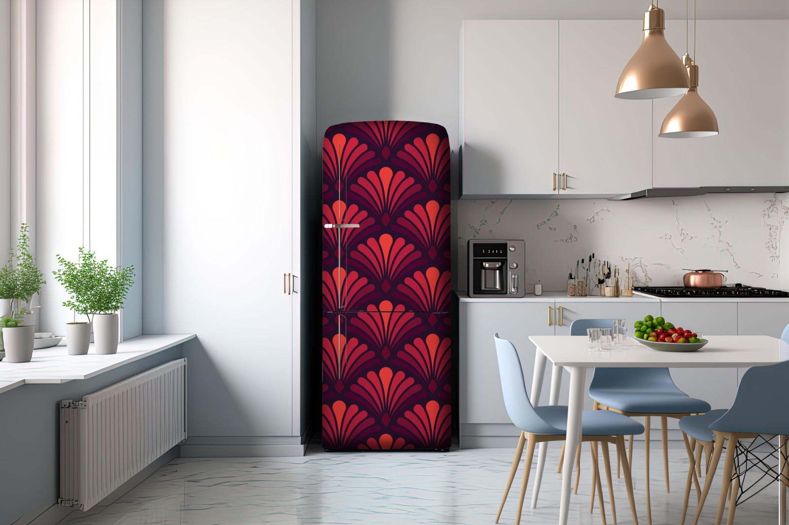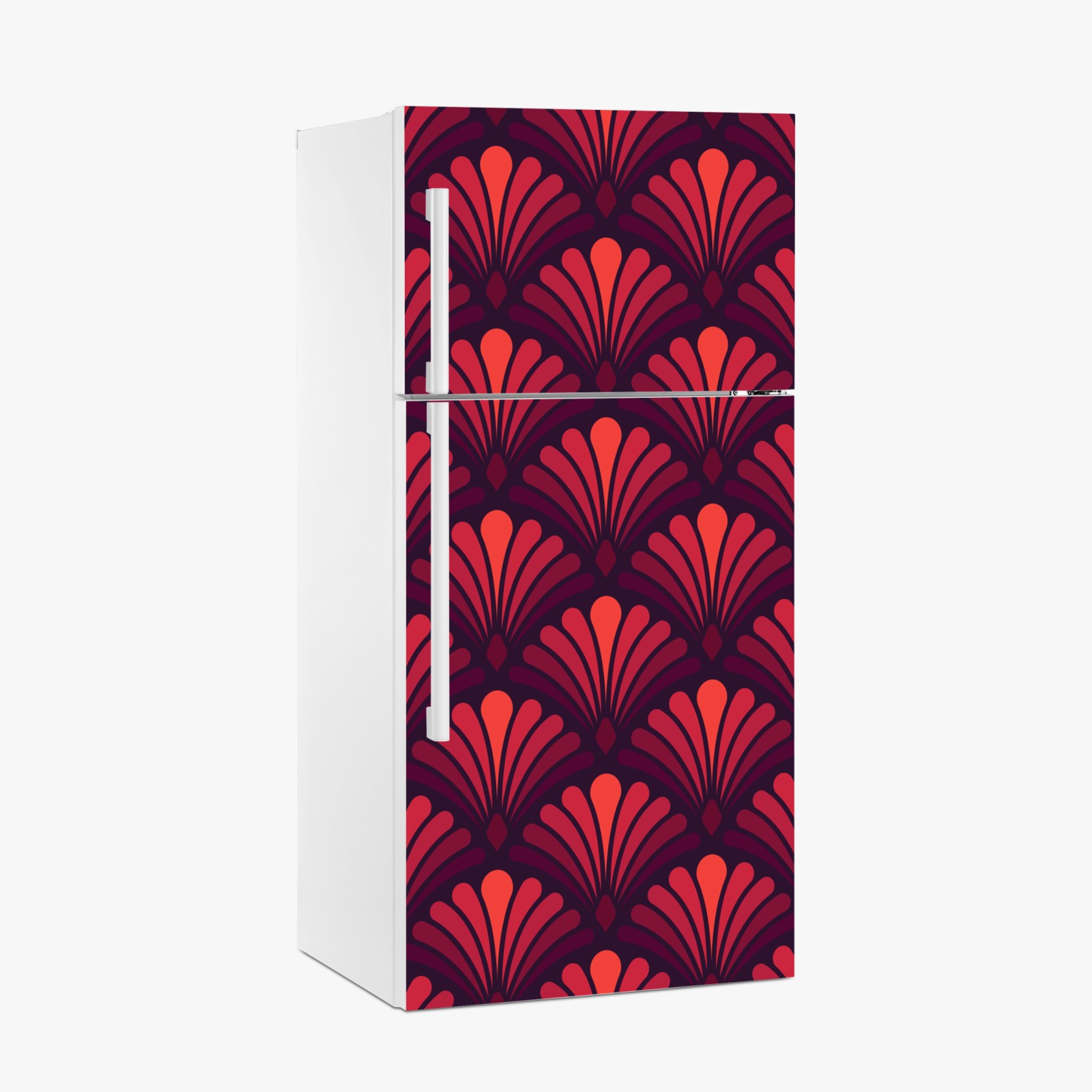 Kühlschrankaufkleber geometrisches art-déco fächermuster in warmen rot- und violetttönen
