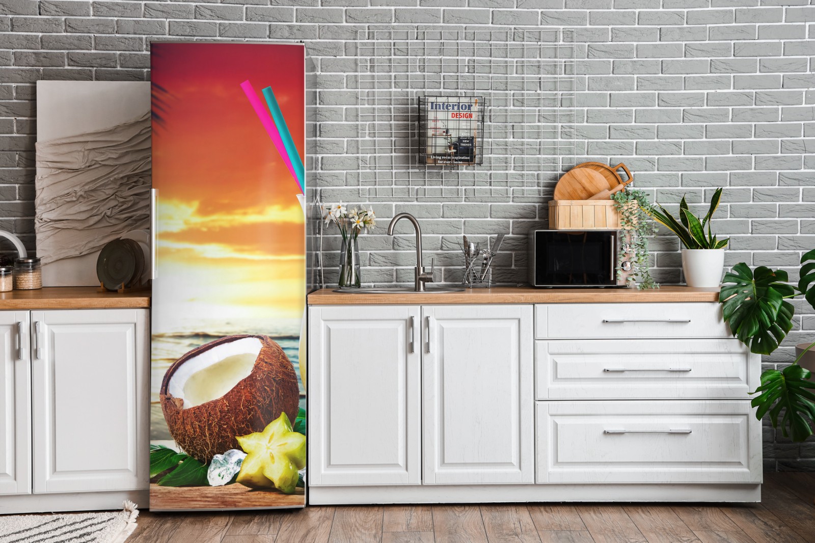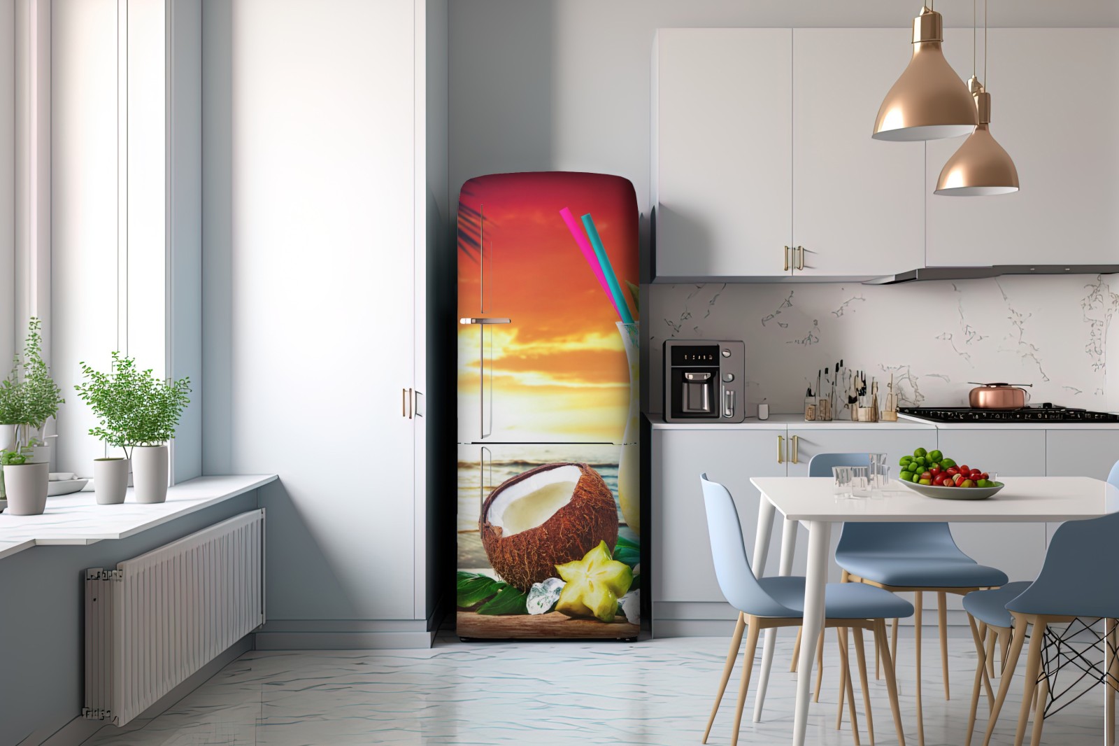 Lebendige tropische Szene mit erfrischendem Cocktail, frischer Ananas und Kokosnuss vor einem goldenen Strandsonnenuntergang, perfekt um sommerliches Flair in jeden Raum zu bringen.