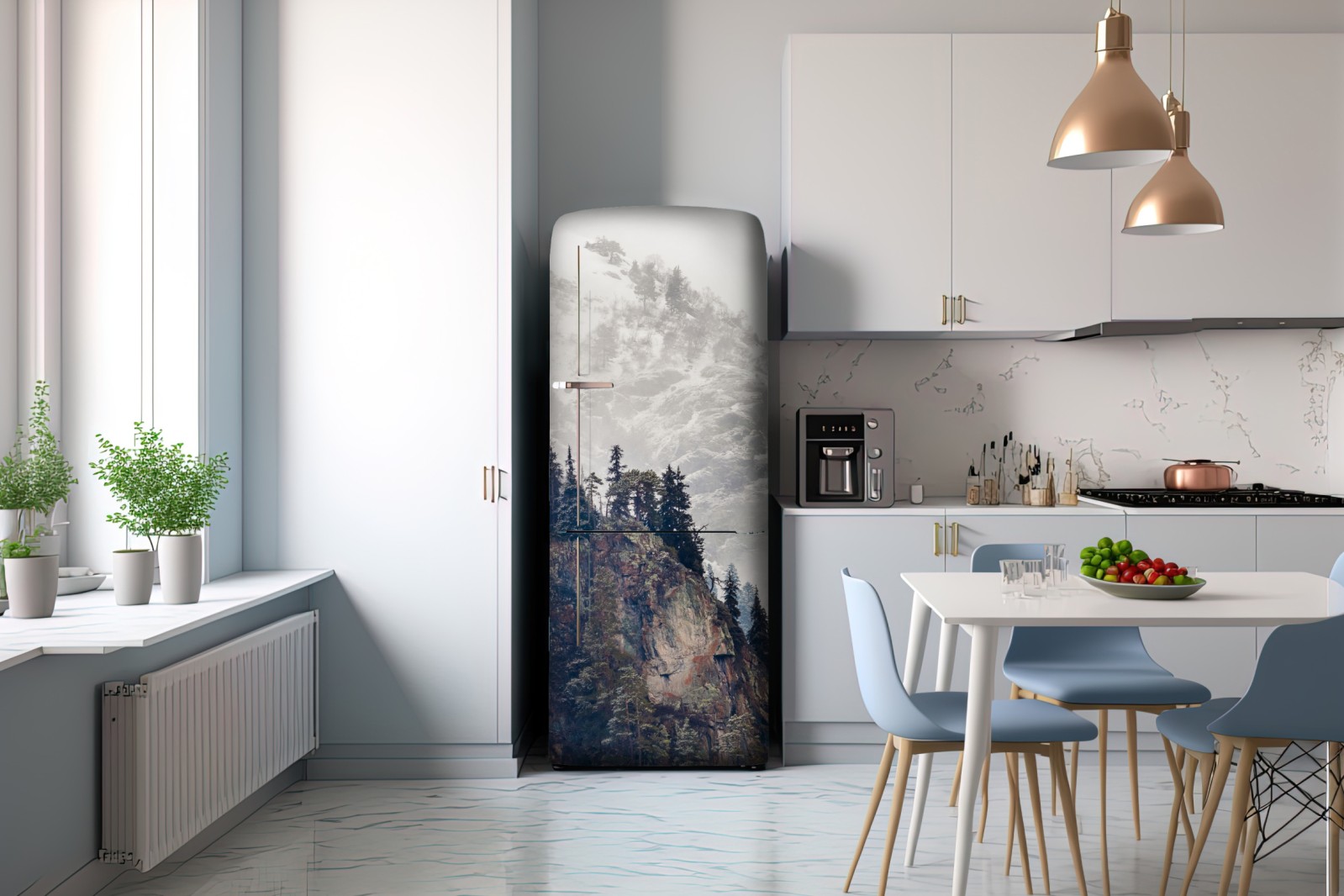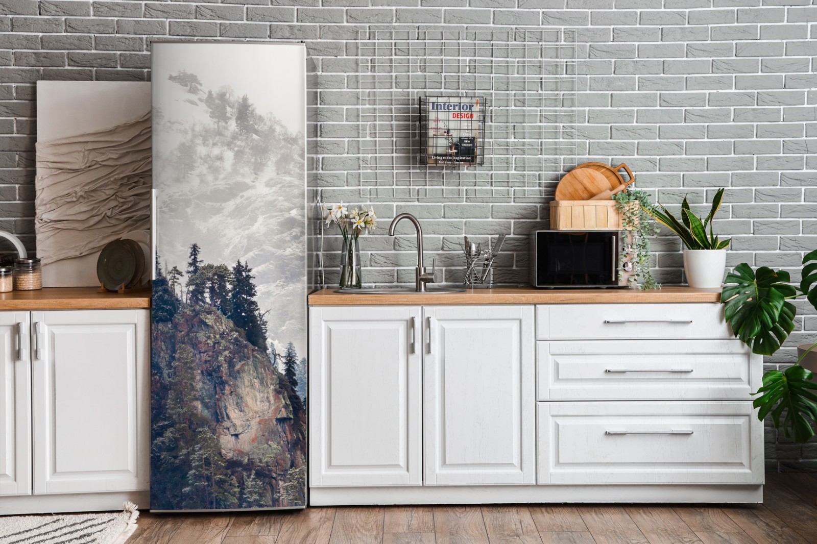 Kühlschrankaufkleber nebliger berg mit felsklippe und kieferwald