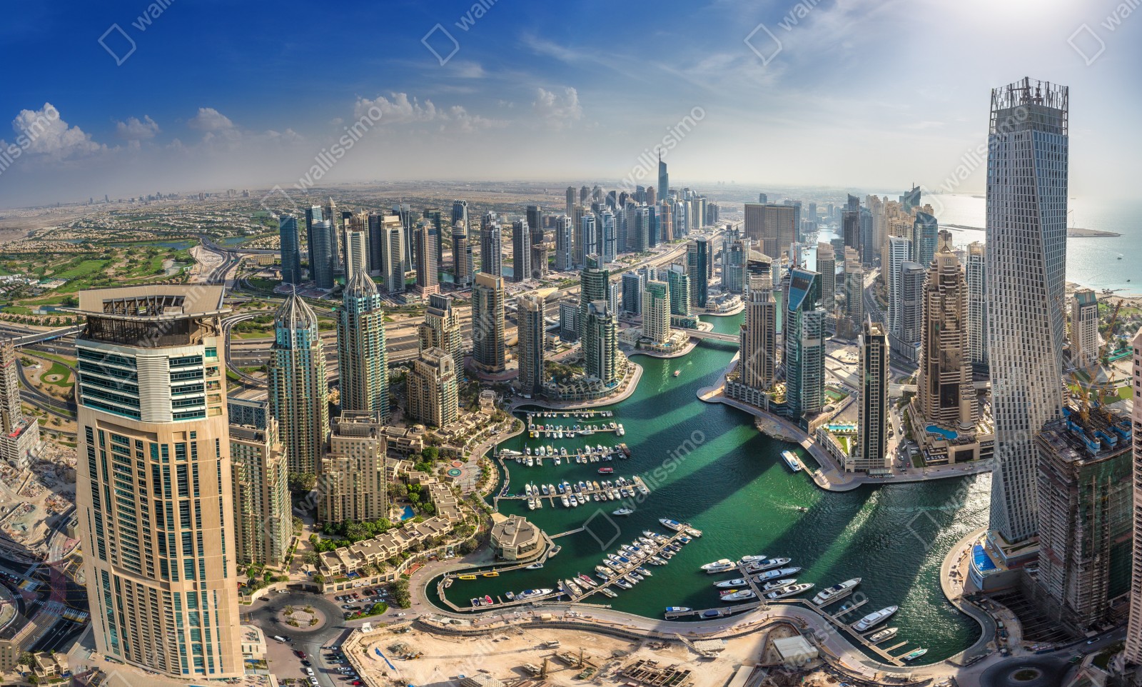 Beeindruckende Panoramaaufnahme von Dubai Marina mit türkisfarbenem Wasser und modernen Wolkenkratzern, perfekt um jedem Raum urbanen Stil zu verleihen.