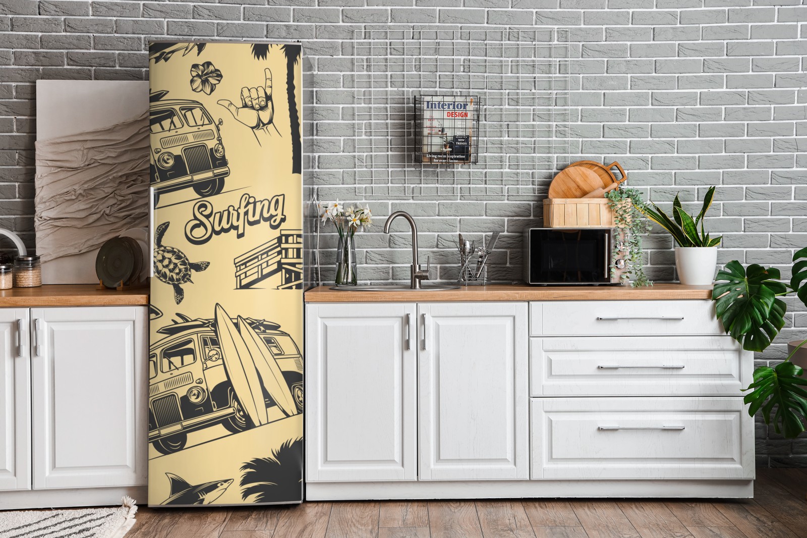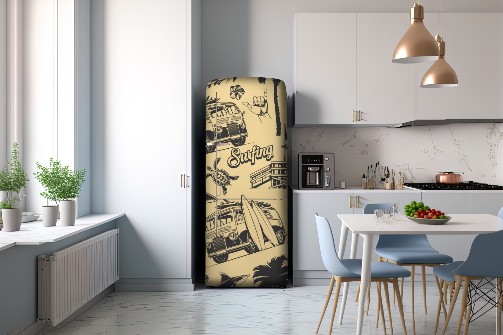 Kühlschrankaufkleber retro surfing muster mit campingbus und wellen