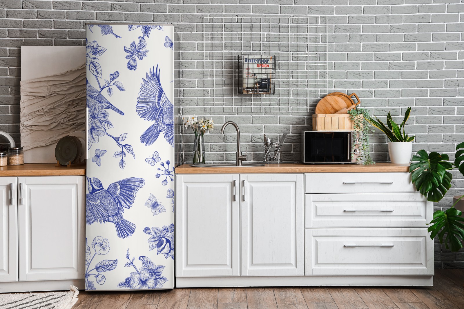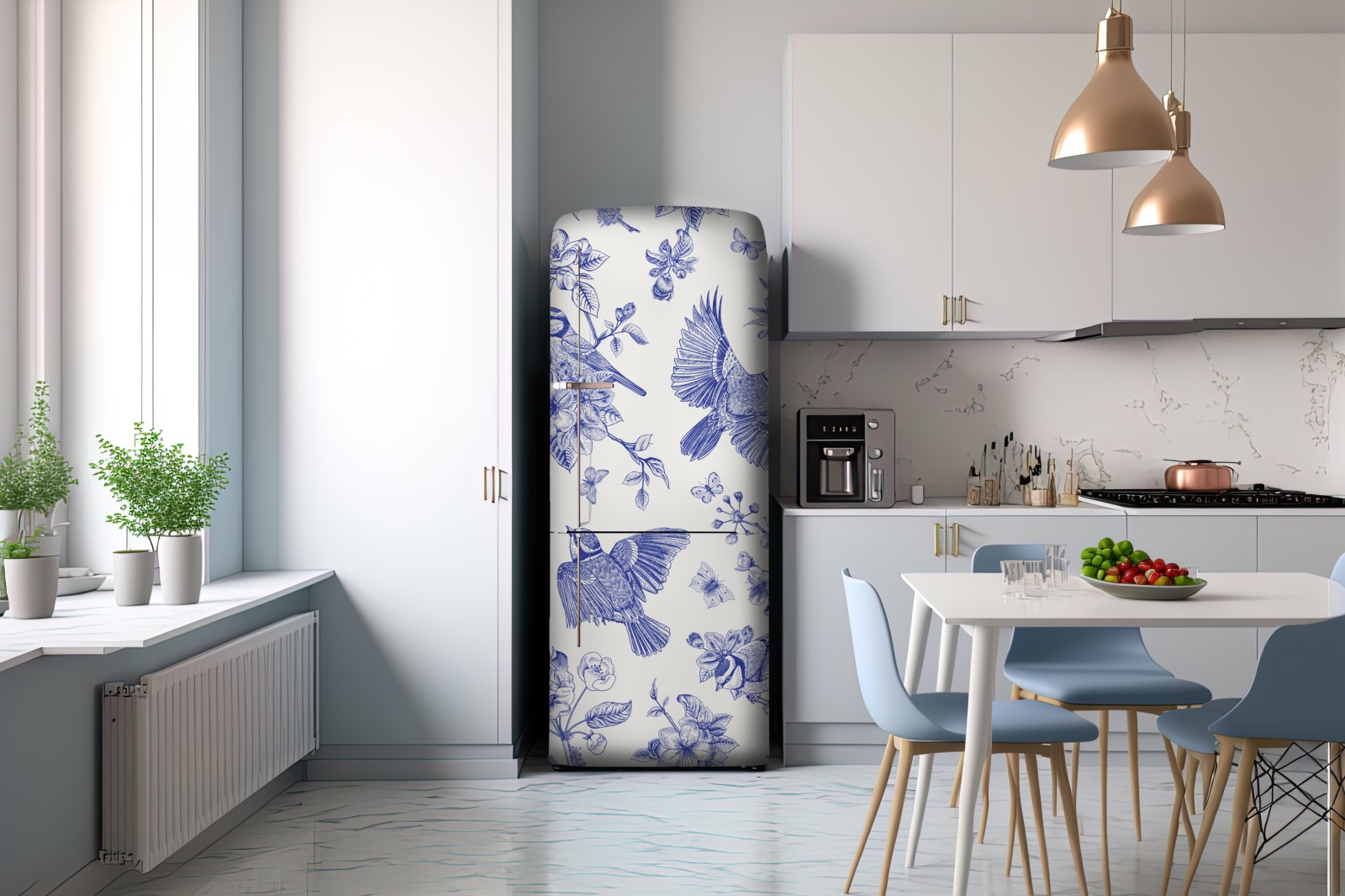 Kühlschrankaufkleber blaues muster mit vögeln und blüten im vintage-stil
