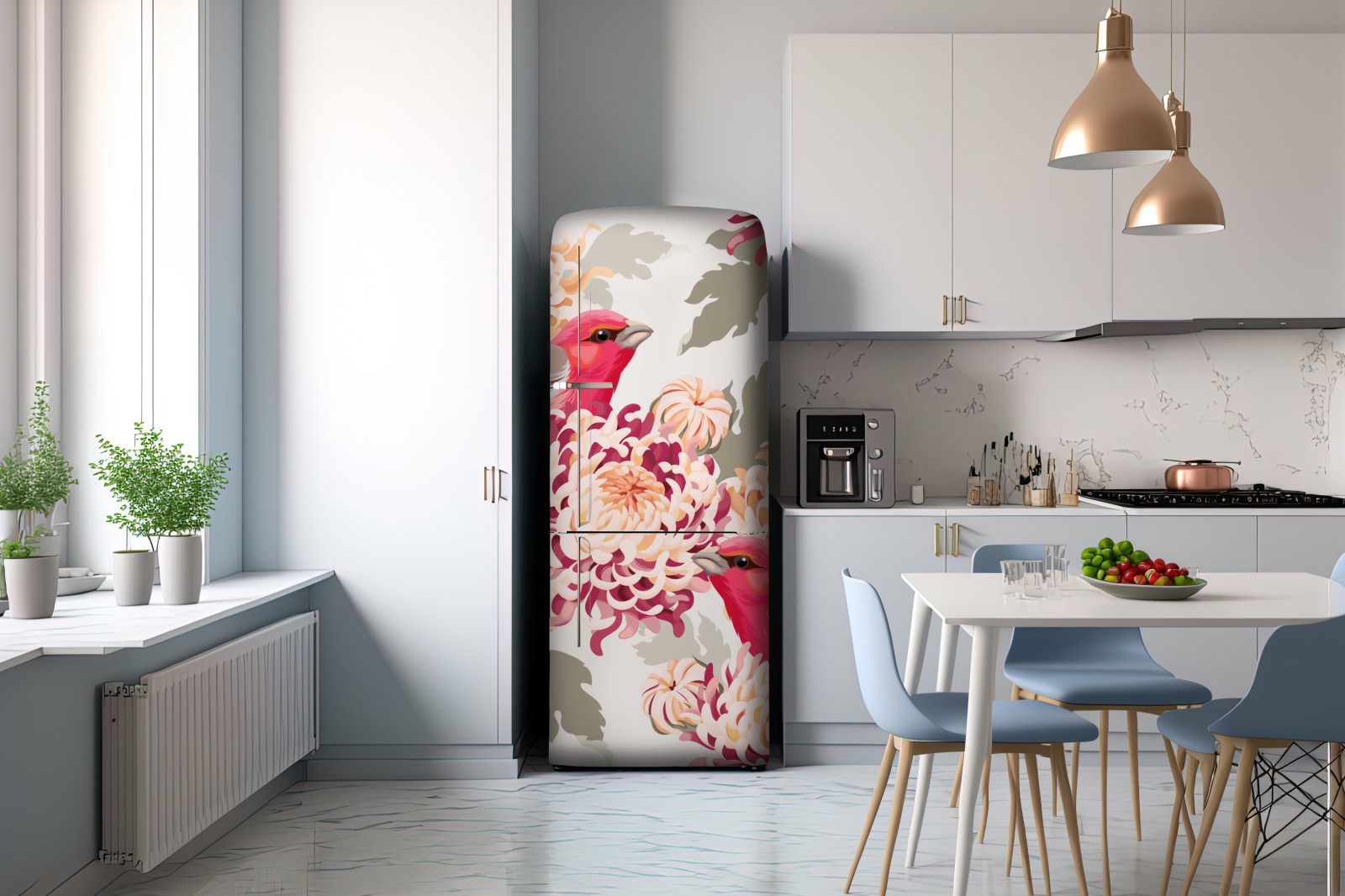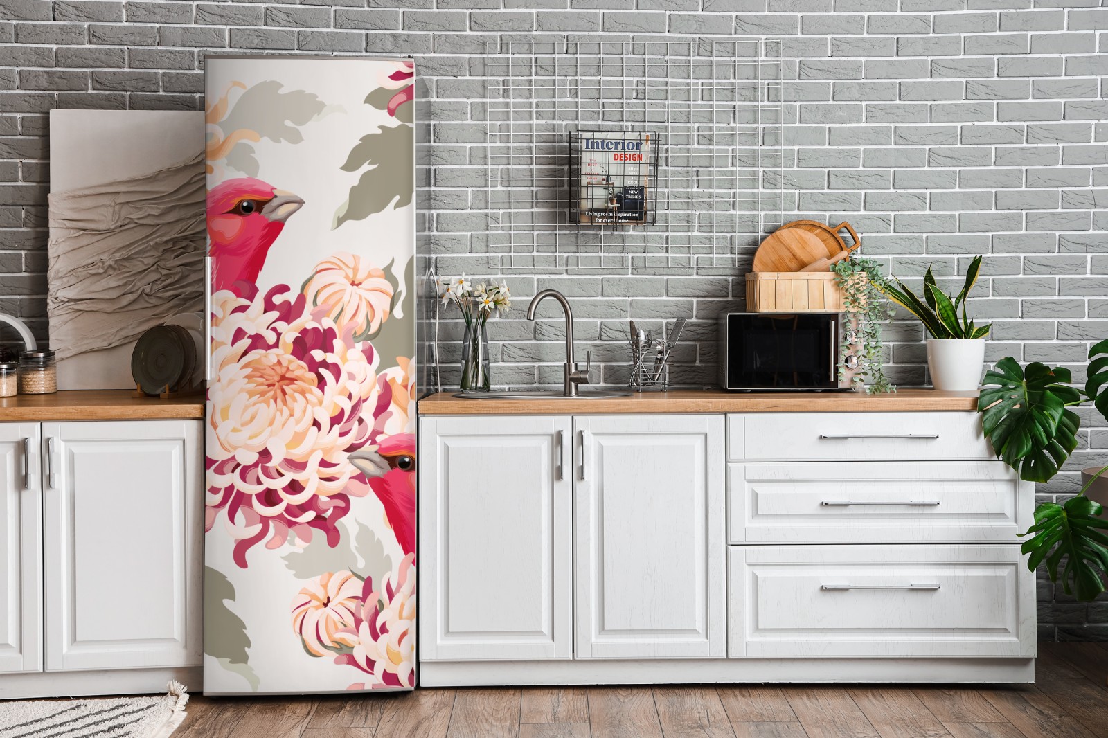 Kühlschrankaufkleber rosa vögel und chryzanthemenmuster
